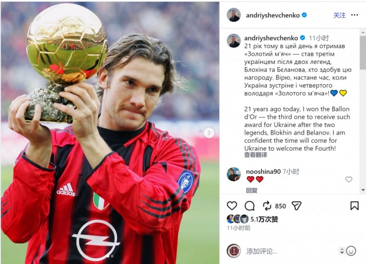 舍甫琴科社媒晒出自己与金球奖杯的合照,配文:“21年前的今天,我赢得金球奖,成为继布洛欣和别拉诺夫之后,第三位获得这一奖项的乌克兰球员。我相信乌克兰终会迎来第四位金球奖得主!”