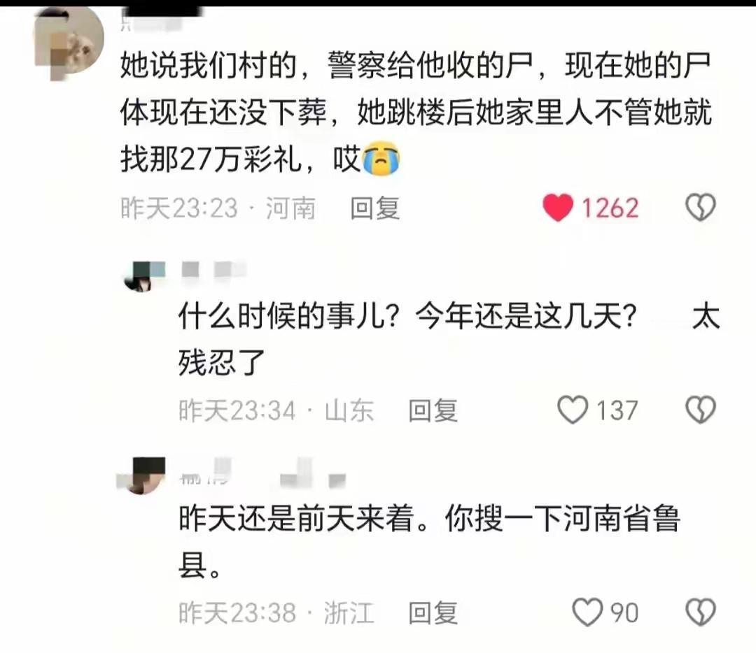 结婚当天跳楼的女孩,最后一条朋友圈,给我看哭了。她最后争取来的自由,竟然是挫骨扬灰…… 结婚照上,女孩没有一丝笑容,喜服的大红色,都没挡住那种溢出屏幕的压抑。她双手机械交叠在一起,僵直着身体,仿佛在对抗。 完成这个悲剧,原因有三: 1、她是善良“软妹子”。 从上大学开始,家里就想着早日把她嫁出去,她对抗过,但没有用。父母以死相逼,所有亲戚指责她不孝。 她妥协了,又恨自己懦弱。 如果她狠心一点,完全可以一走了之,远走高飞,过自己的人生,不去管那些歇斯底里的胁迫。 2、结婚对象她不喜欢。 对象对她应该不太尊重,所以她说“蹬鼻子上脸”“只会气人”,但即便受了委屈,父母也只会让她忍。 3、她一直被掌控。 她说“以前我无论如何都得不到钱”,她同意结婚了,就突然有钱了。父母给了钱,结婚对象也给了钱。可以看出,经济控制,应该也是父母逼她结婚的手段。作为一个中学老师,是有收入的,但为何以前没钱?看见家人一直比较强势。 她在朋友圈发遗书, 只希望有人能给她火化,然后在一个有阳光和大风的天气,把她挫骨扬灰…… 想要挫骨扬灰, 是她不想入娘家坟,也不想进婆家冢,这是她期待的自由。 她是历史老师,读过那么多历史人物,给学生讲霸王,讲刘邦,讲韩信,讲秦皇汉武……却最终没有逃脱现实的束缚。 我不反对结婚, 但不能为了结婚而结婚。这样做,是对人生极大的不负责任。但在有些人眼里,简直不孝有三,不婚为大! 血的教训告诉我们,作为父母、长辈千万不要催婚、逼婚!那是年轻人一辈子的事,他们幸福,愿意,才重要,相比之下,所谓的面子,别人的议论啥也不是。 世间百态 真实故事