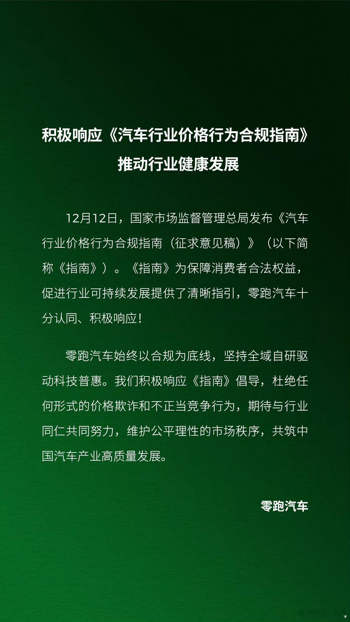 比亚迪、零跑等品牌发文,积极响应《汽车行业价格行为合规指南》维护公平竞争秩序,促