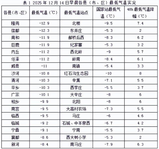 受冷空气影响,13到14日早晨我市最低气温持续下降2~8℃,14日早晨国家气象站最低气温降至-10~-5.3℃。全市最低气温出现在隆尧北楼-12.9℃。48小时最低气温降幅最大出现在沙河为8℃。13日我市信都、内丘、临城出现8级以上大风天气,最大信都天河山24米/秒(9级)。