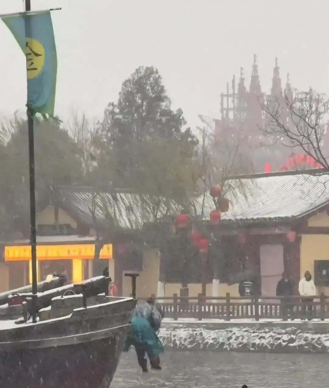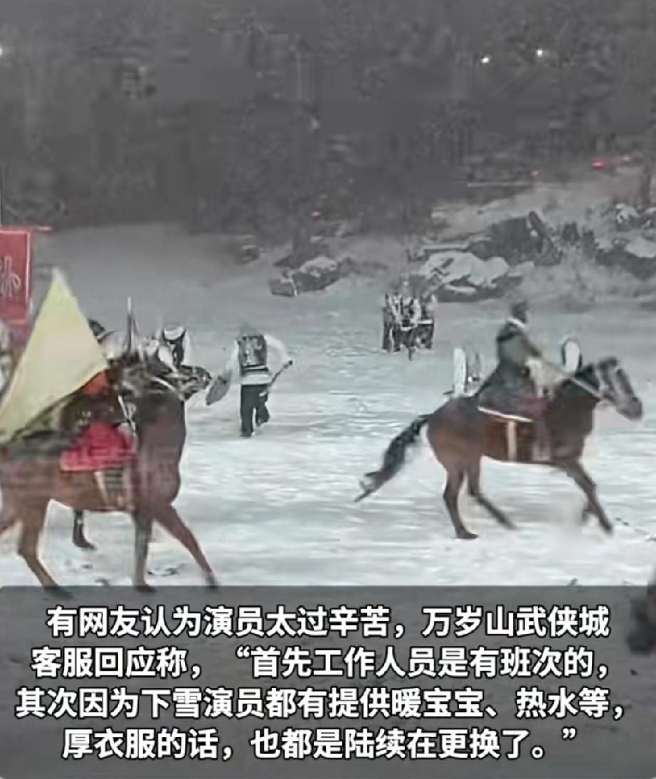 近日,河南开封下起了鹅毛大雪,万岁山武侠城的演员们的表演却热情似火。游客看到一位演员如同冰雕,身上落满积雪,胡子眉毛挂满了冰凌,立于冰天雪地之中。还有的演员在船上,被官兵追杀,抱着包袱跳入冰冷的河里。游客感叹演员太敬业了,同时也担心演员能否吃得消。 景区客服作出回应称。这是正常演出,演员是有班次的,为演员提供了暖宝宝、热水等保暖措施。 演员的敬业精神值得敬佩。景区虽然采取一些保暖措施,但效果应当有限。景区应当在追求演出的逼真时,还要注意保护演员的健康和安全。 游客称景区演员被冻成“冰雕”万岁山武侠城