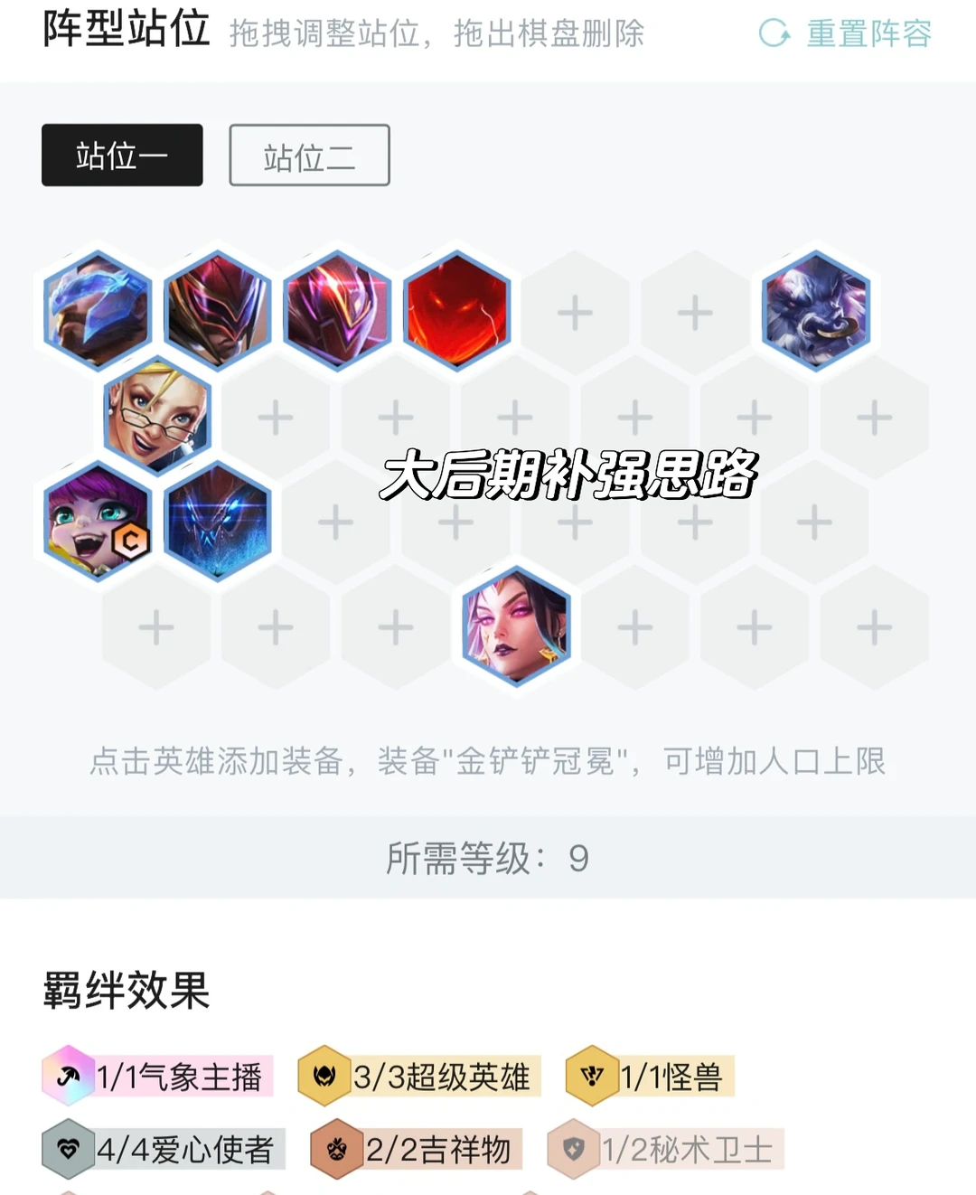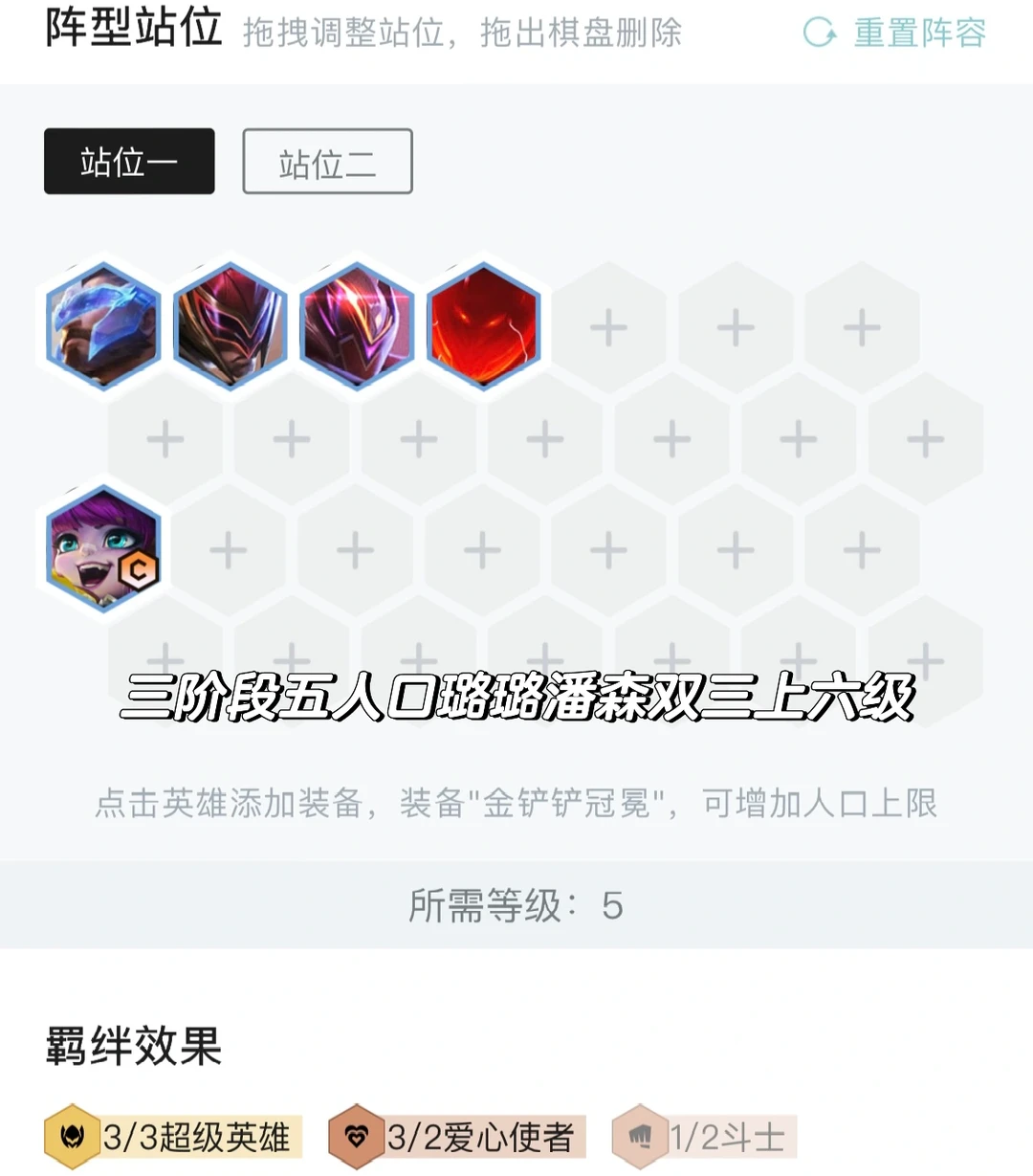 大概三阶段选项完需要D出至少一个三星露露或者潘森,然后卡着经济再追其他牌三星,露露潘森双三星上6人口补琴女阵容小成,至于石头人和李青则是看有无超英同行和自己血量经济选择追或不追。