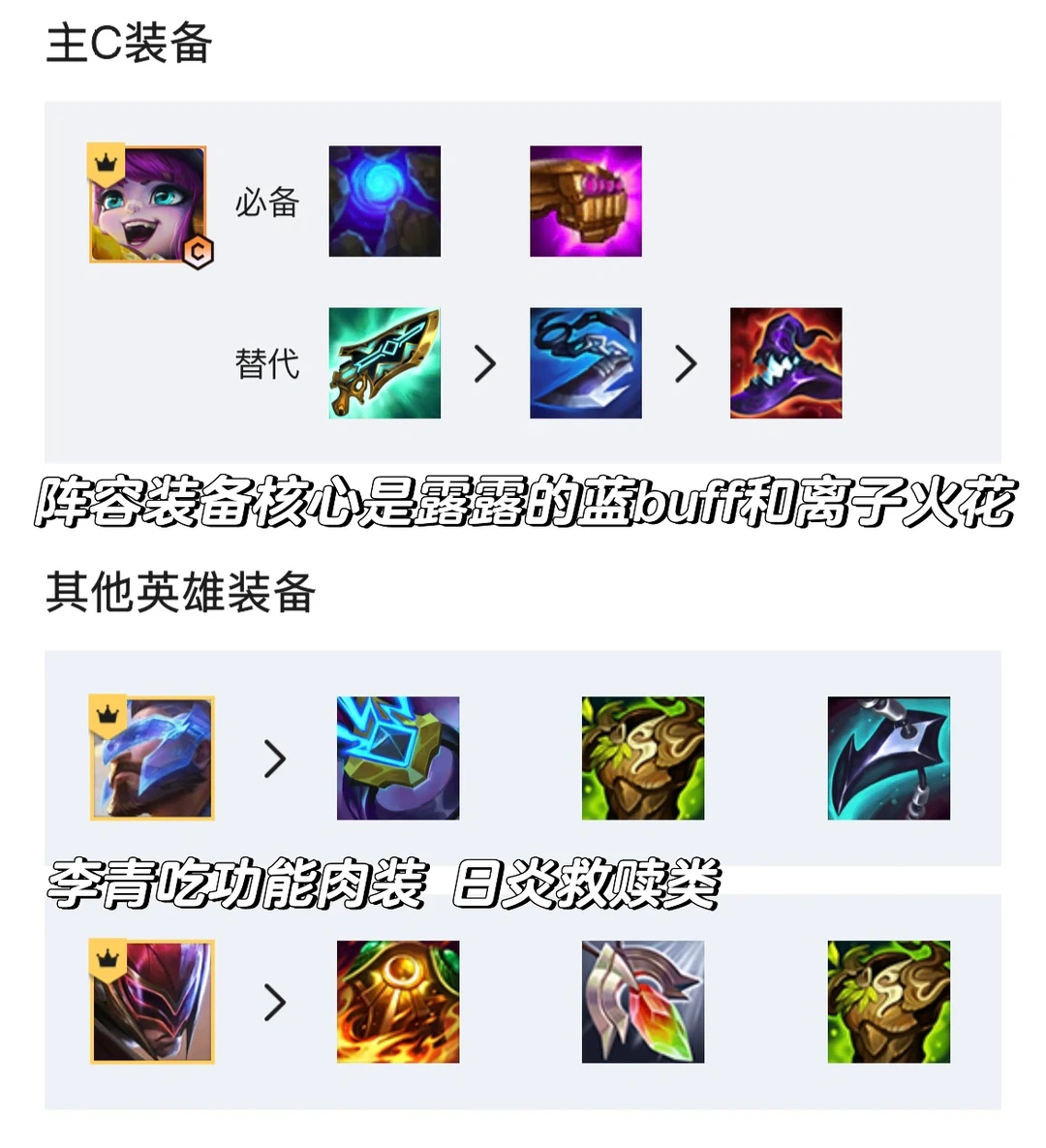 3、这个阵容核心装备是露露的蓝BUFF启动频率和潘森的离子火花破魔抗。