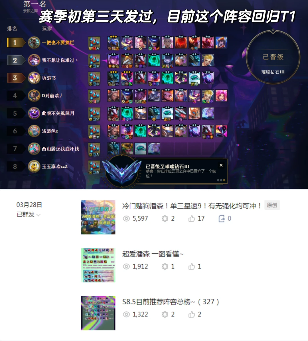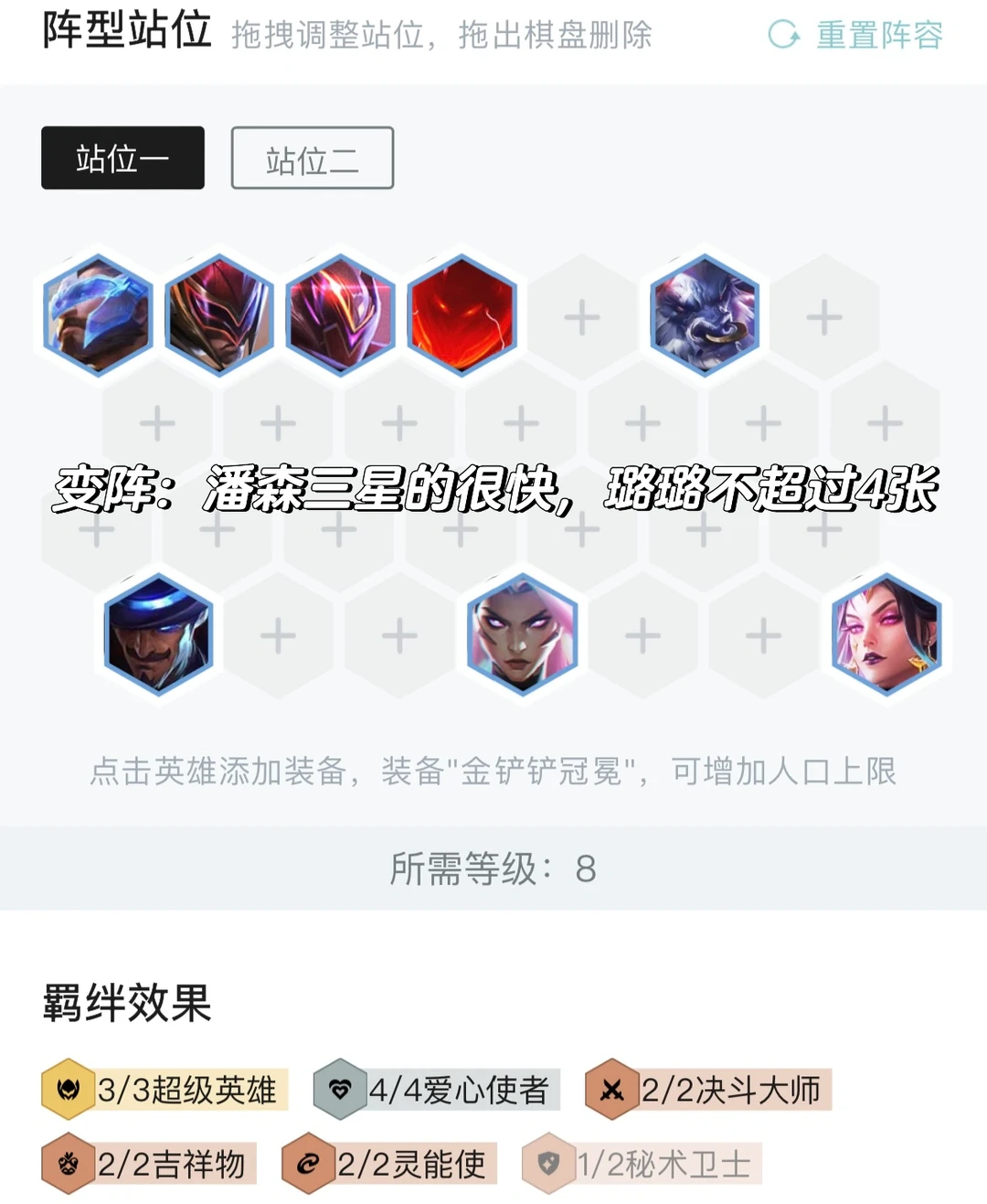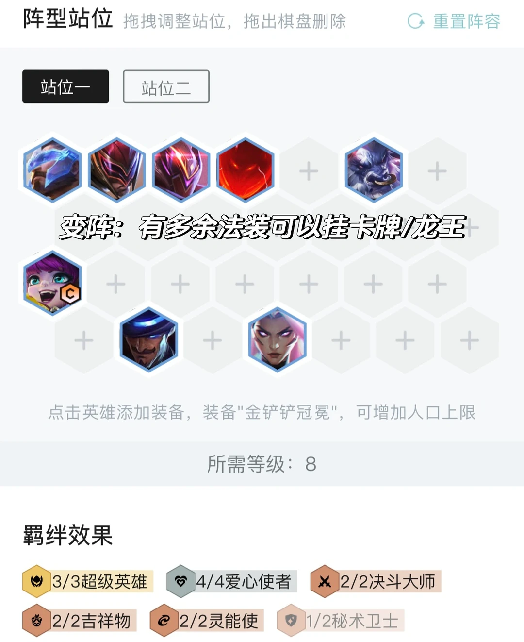 赌狗阵容就是追三星数量来提上限,D不到牌没办法,这也是赌狗的风险,如果潘森三星没露露可以速8转龙王/卡牌C。
