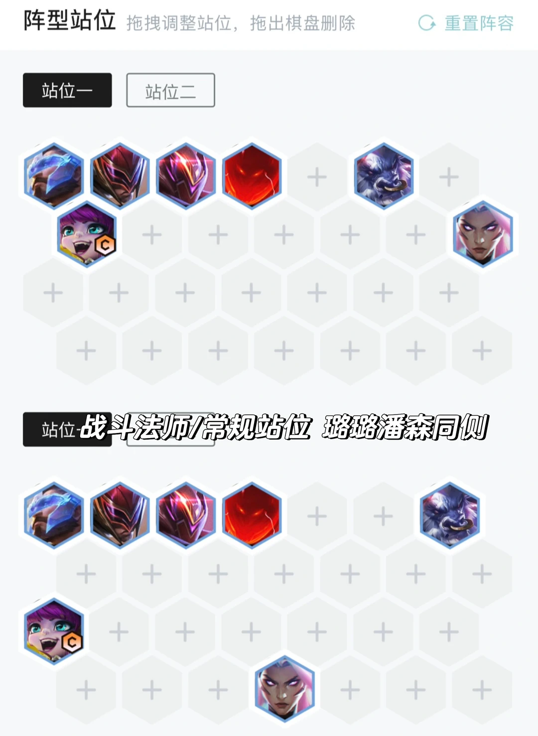 有战法第二排,没有第三排,璐璐手不长,沉底会浪费时间走位,璐璐潘森放一侧形成爆发链。