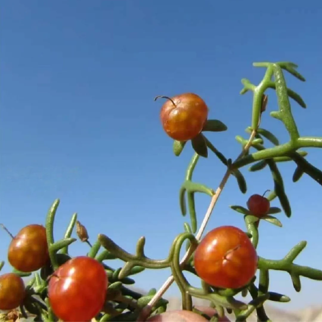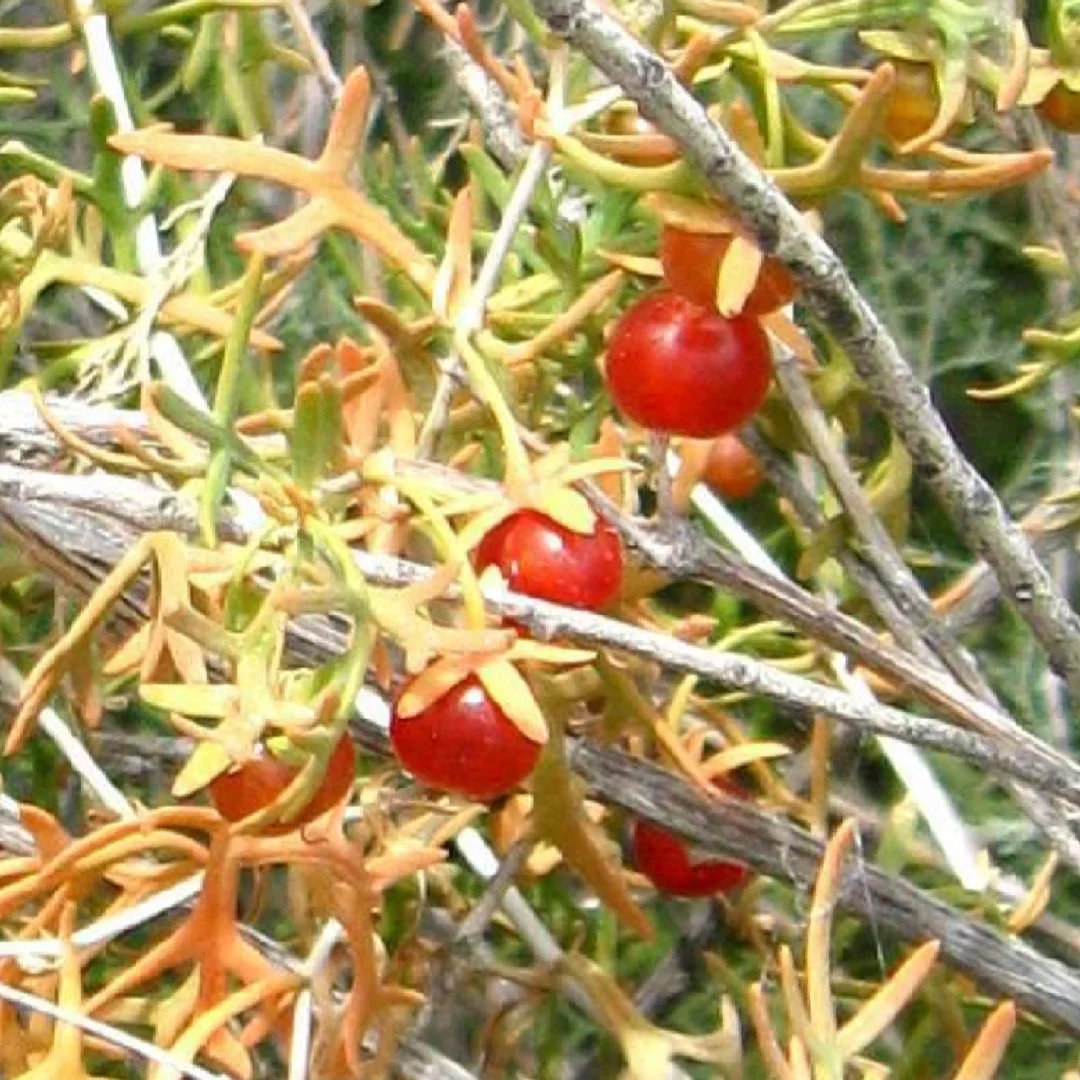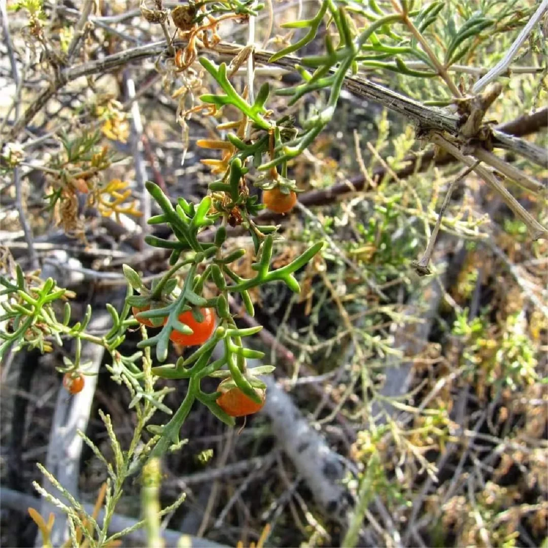 一种常绿植物,非常罕见且美丽,蔓生或匍匐矮子灌木分支的茎和深深浅裂、薄而多汁的叶子。不显眼的黄绿色花s之后是球状的鲜红色果实,直径约1厘米。这些水果可食用,甜美可口。黑果马拉考果树广泛分布于土库曼斯坦、乌兹别克斯坦和伊朗至阿富汗,但仅在砾石、岩石斜坡上的小种群中已知,通常在石膏土上。它最适合夏季炎热干燥、冬季严寒的气候。尽管水果爱好者非常追捧它,但它在栽培方面并不为人所知,可能只有少数几个收藏。播种后,种子可能受益于低温层积。
