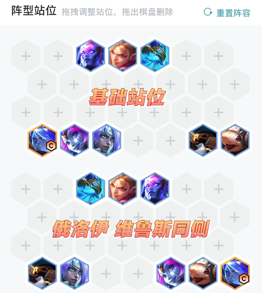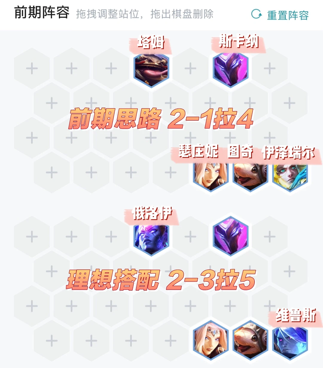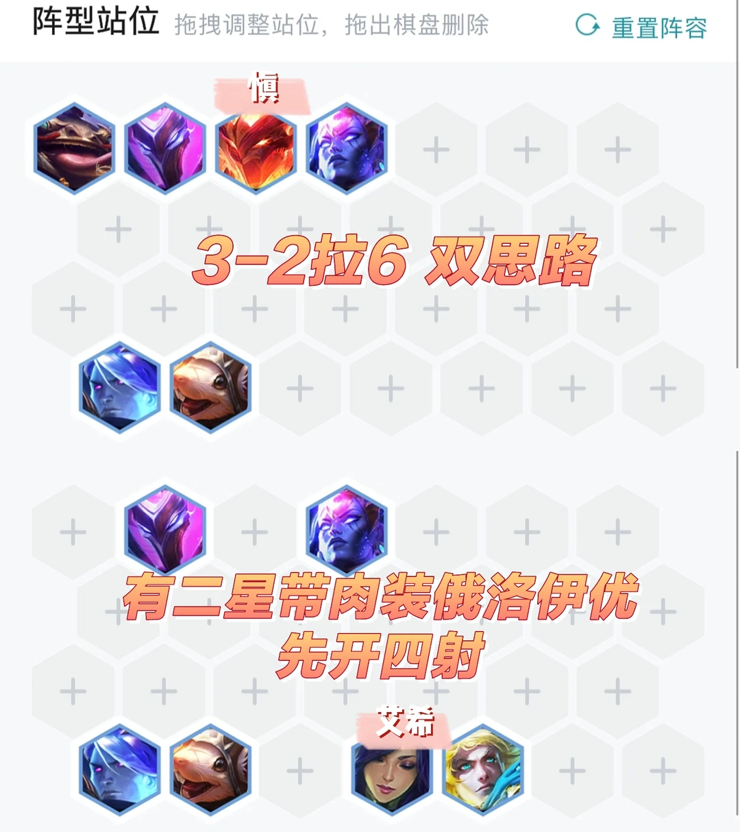 连败速6启动,连胜速7启动,优先做韦鲁斯羊刀然后找俄洛伊的肉,然后再补韦鲁斯的输出装。前期最理想是搭配三星界二斗士二射手过度,没有就看情况搭护卫或者摆烂也行。