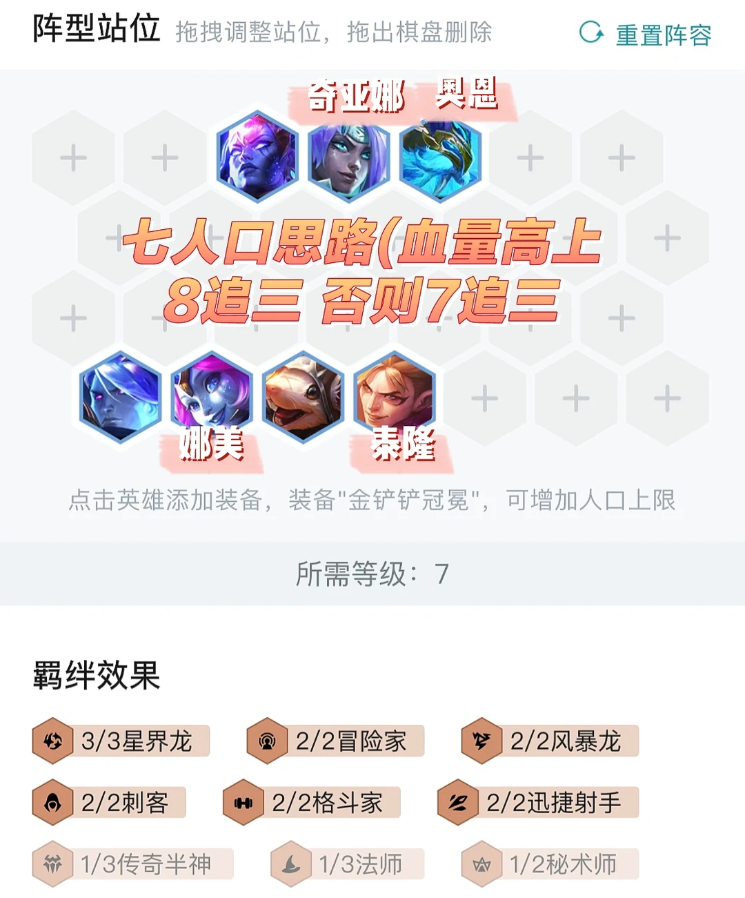 6人口要小抽体系牌,7人口大搜质量,如果血量经济健康则上8再追三星星界牌,血量不高则7人口追出三星星界牌再上人口。