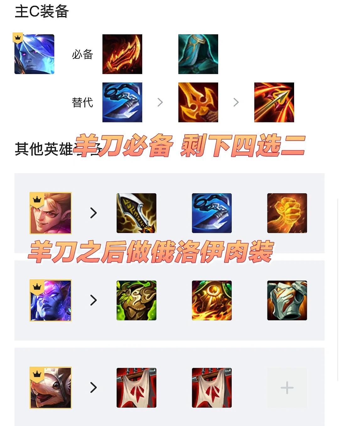 韦鲁斯必备羊刀,剩余两件巨杀水银杀人分裂箭四选二,有就做不等。俄洛伊优先堆血量因为技能机制抗性本身不会很低,多余AD装备都给泰隆,冰心旗帜这种功能装给奇亚娜老鼠,山羊大后期选择找偷偷或者多余肉装。