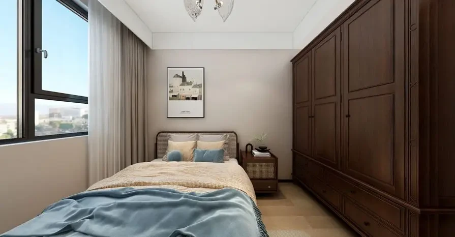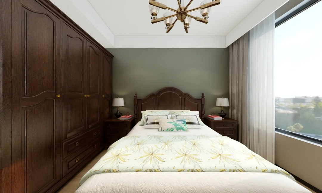 ♟主卧的设计十分简单,整体还是以墨绿色+奶油色为主。浓浓美式复古气息的重工木质通顶衣柜+同样材质的床头搭配着金属吊灯,既不会觉得过分厚重,同时又带有一丝轻奢氛围。
