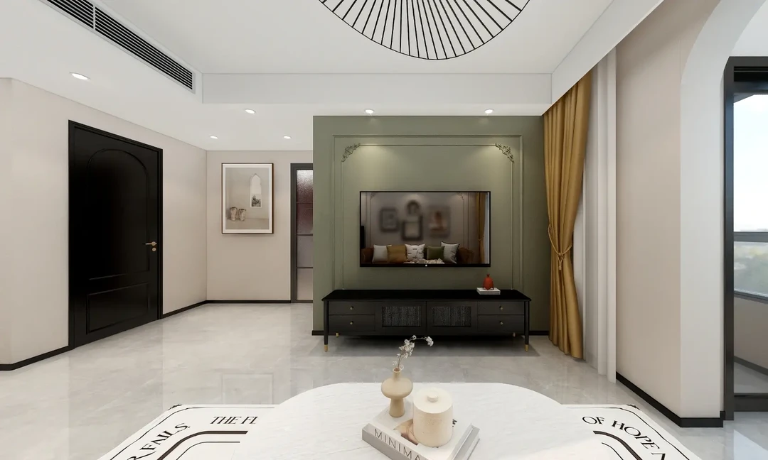 电视背景墙选择平铺墨绿色,不会特别低沉但又十分浓厚的复古氛围。重工木质电视收纳柜满满的高级感,同时又能满足日常收纳工作。