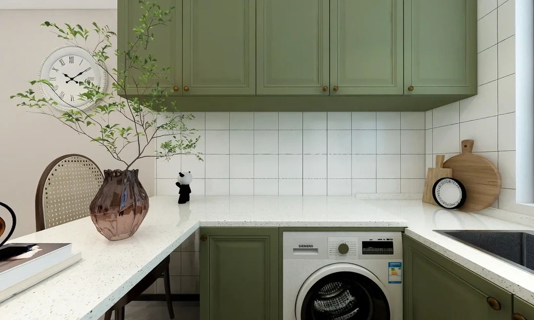 ♟厨房在原先U型橱柜的基础上定制了一体式中岛吧台,在厨房的动线能够更加流畅。同时它既可以扩大工作台、橱柜和用餐空间的面积又可以凭借自身造型成为厨房中的视觉焦点,舒服又有范儿~