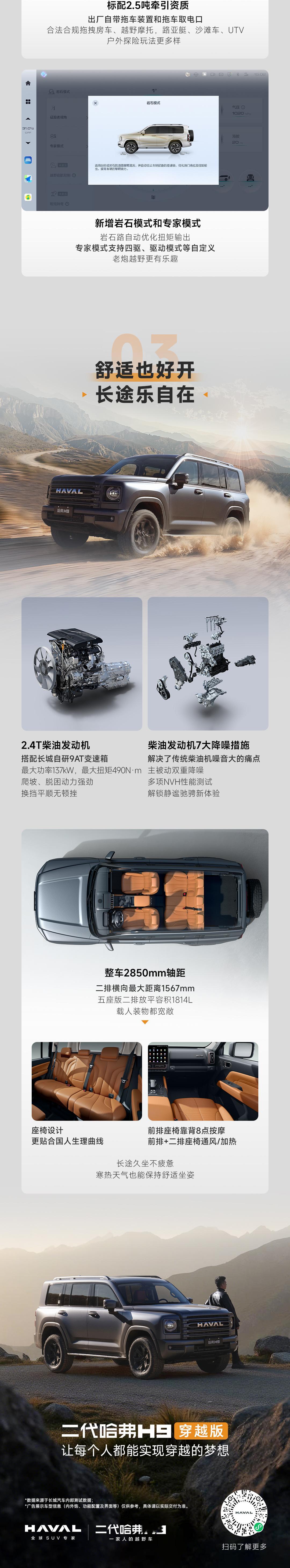 二代哈弗H9穿越版,25.79万,限时23.29万。划重点,2.4T柴油+纵置9AT变速箱+带MLOCK中央差速器机械锁止机构+标配前后差速锁,标配265 65 18 AT,标配2.5T拖车资质,标配硅油风扇,ETC,可选5座or7座。然后再划重点,原厂双油箱,共131L,主油箱78L,副油箱53L。这家伙是柴油的,这么大邮箱的柴油越野车,续航能力真的无敌了。底盘升高30mm,离地间隙来到235mm。这妥妥就是一个方方面面都是原厂配置的官方改装版。所有的东西都有质保,都是原厂品质,对柴油越野车控来说,23.29万能给这配置....过年了吧.....
