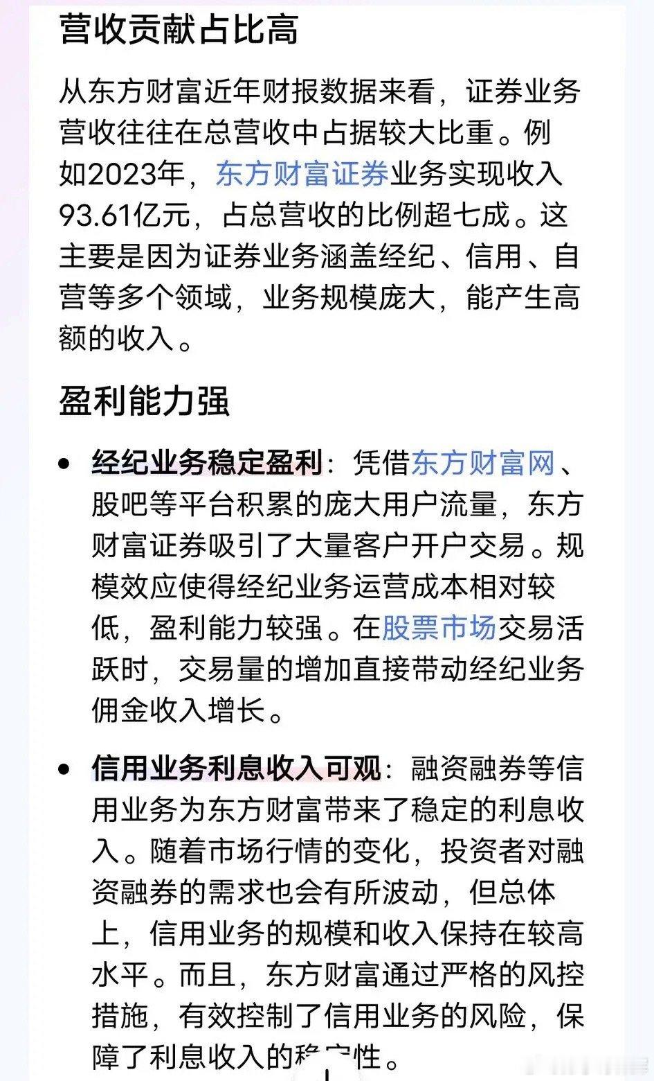 东方财富东方财富主要的收入来源,还是要靠两大头业务:一是:广大普通散户交易的佣金,二是:融资融券的利息。所以说每次牛市来了的时候,第一个冲的就是东方财富,因为它主营业务占的比例太大了,它的用户量比较广,互联网金融它的知名度最高,每次牛市来了它的反应是最强烈的。它做其他业务收入占比例很低的,所以它为什么叫互联网金融就是这个原因。它比传统的券商有很大的优势,它没有地域限制,相比其它同类业绩的上市公司市值也比较高。盈利能力很强,现在的股价说高也不高,说低也不低,中间水平。