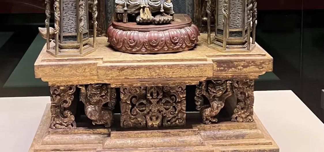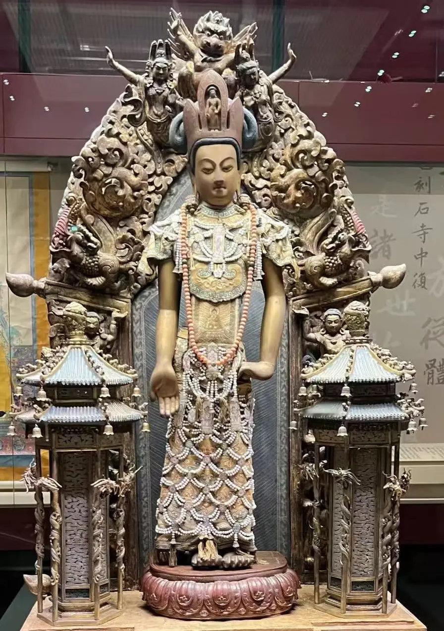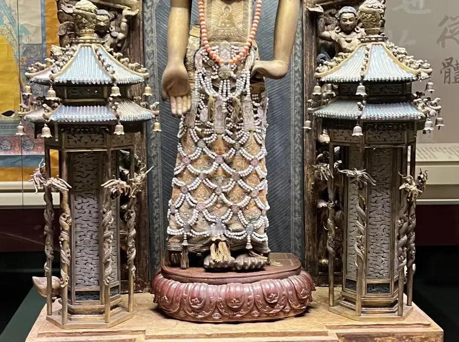故宫与西藏文物联展‘祥开万象’里的檀香木观音,是藏汉工艺交融的千年对话。老山檀香木的肌理中沉睡着岁月香气,藏式镶嵌的松石珊瑚、汉式透雕的龙纹背光,鎏金璎珞垂落的每颗珠子,都在诉说工艺的繁复。立姿观音身带藏式‘三屈式’动态,却有汉式温婉的慈悲面容,背后火焰纹龙背光是藏地工艺的细腻,莲台下鎏金亭台连瓦当都清晰,亭内经卷法器的微缩,让历史触手可及。藏汉技艺在这尊檀香木像上凝成诗,醉人的香气里,是时光雕琢的东方美学。