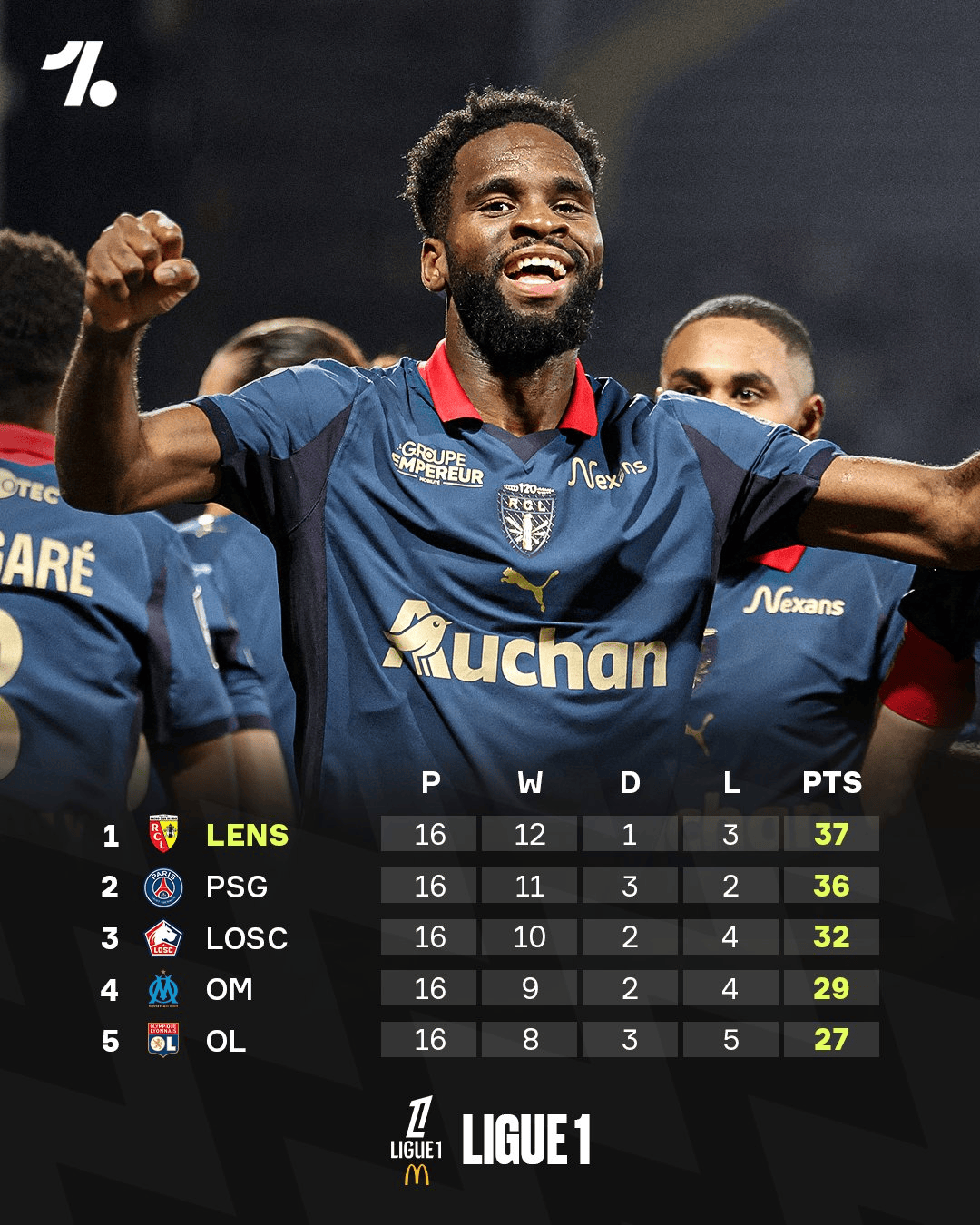 虎扑12月15日讯法甲第16轮,朗斯主场2-0击败尼斯,继续排在法甲积分榜榜首。