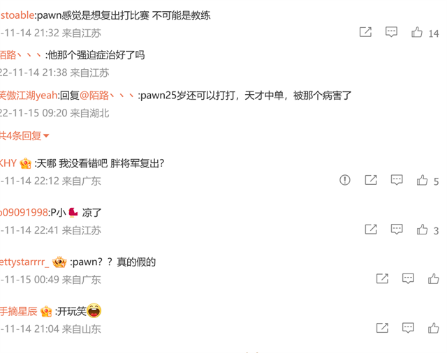 第三点,DC也开始学doinb用英雄代指选手,他们说:男刀再次翻过了墙,大家猜测,这一条说的可能是pawn选手复出。pawn曾经是EDG选手,后来因为心理问题不得不离开赛场。