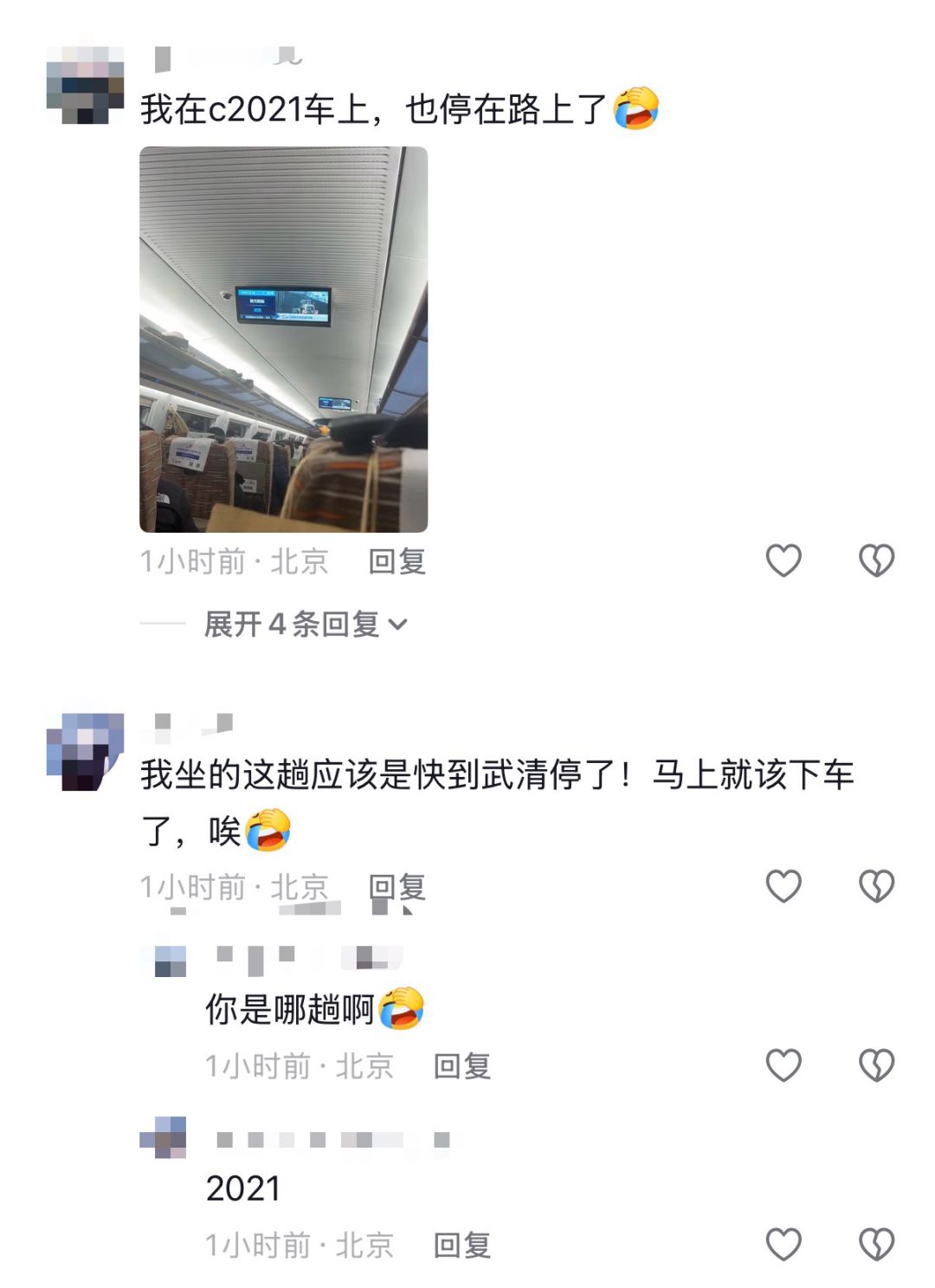 一位网友称自己乘坐的C2021在快到武清站的时候停了约一个半小时后才恢复运行。