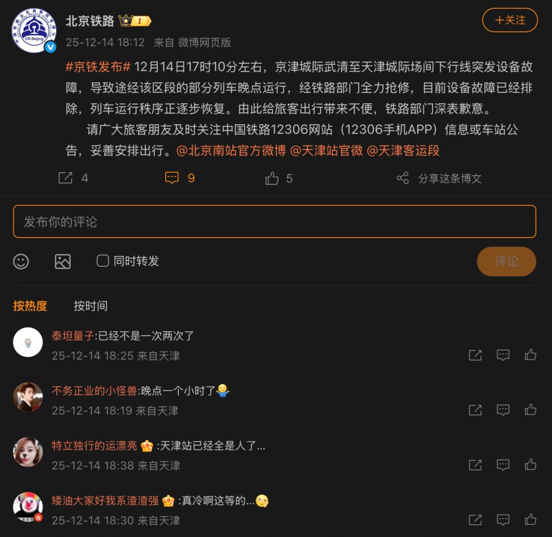 针对以上列车大面积延误情况,14日晚18时许,北京铁路官方账号回应称:12月14日17时10分左右,京津城际武清至天津城际场间下行线突发设备故障,导致途经该区段的部分列车晚点运行,经铁路部门全力抢修,目前设备故障已经排除,列车运行秩序正逐步恢复。由此给旅客出行带来不便,铁路部门深表歉意。