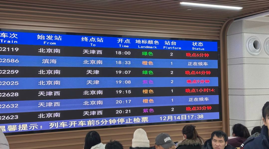 12月14日下午,京津城际列车出现部分列车延误情况。乘客赵先生告诉津云记者,其乘坐的C2254次列车计划17:12发车,最终在18:35顺利发车,于19:11到达北京南站。