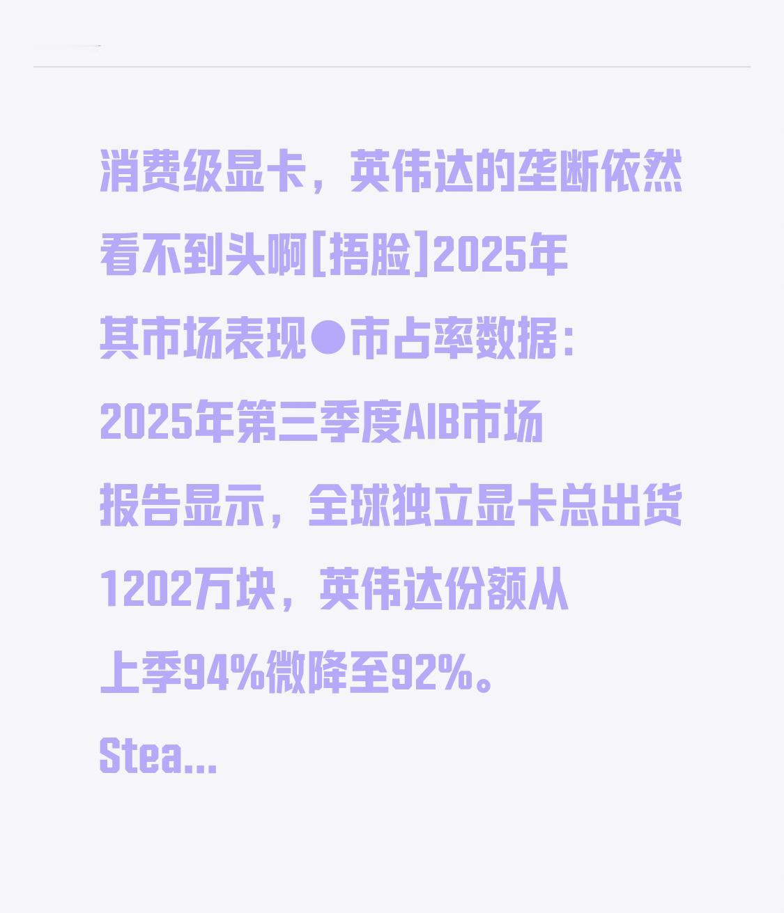 消费级显卡,英伟达的垄断依然看不到头啊[捂脸]2025年其市场表现 ●市占率数据:2025年第三季度AIB市场报告显示,全球独立显卡总出货1202万块,英伟达份额从上季94%微降至92%。Steam 2025年11月报告显示其显卡使用率73.83%。 ●具体型号表现: ○RTX 50系列:势头强劲,RTX 5070超越前代,11月使用率2.23%,排Steam排行榜第11位,RTX 5060和RTX 5060 Ti进入Top20。2025年6月,RTX 5070在亚马逊美国销量5450台排第一,RTX 5060 Ti销4950台,RTX 5070 Ti销4400台。11月抖音销量榜里,RTX 5060排第一,RTX 5060 Ti排第二,RTX 5070排第五。 ○其他系列:RTX 4060 Laptop GPU在11月Steam排行榜居首,前五还有RTX 3060、RTX 4060、RTX 3050、GTX 1650 。