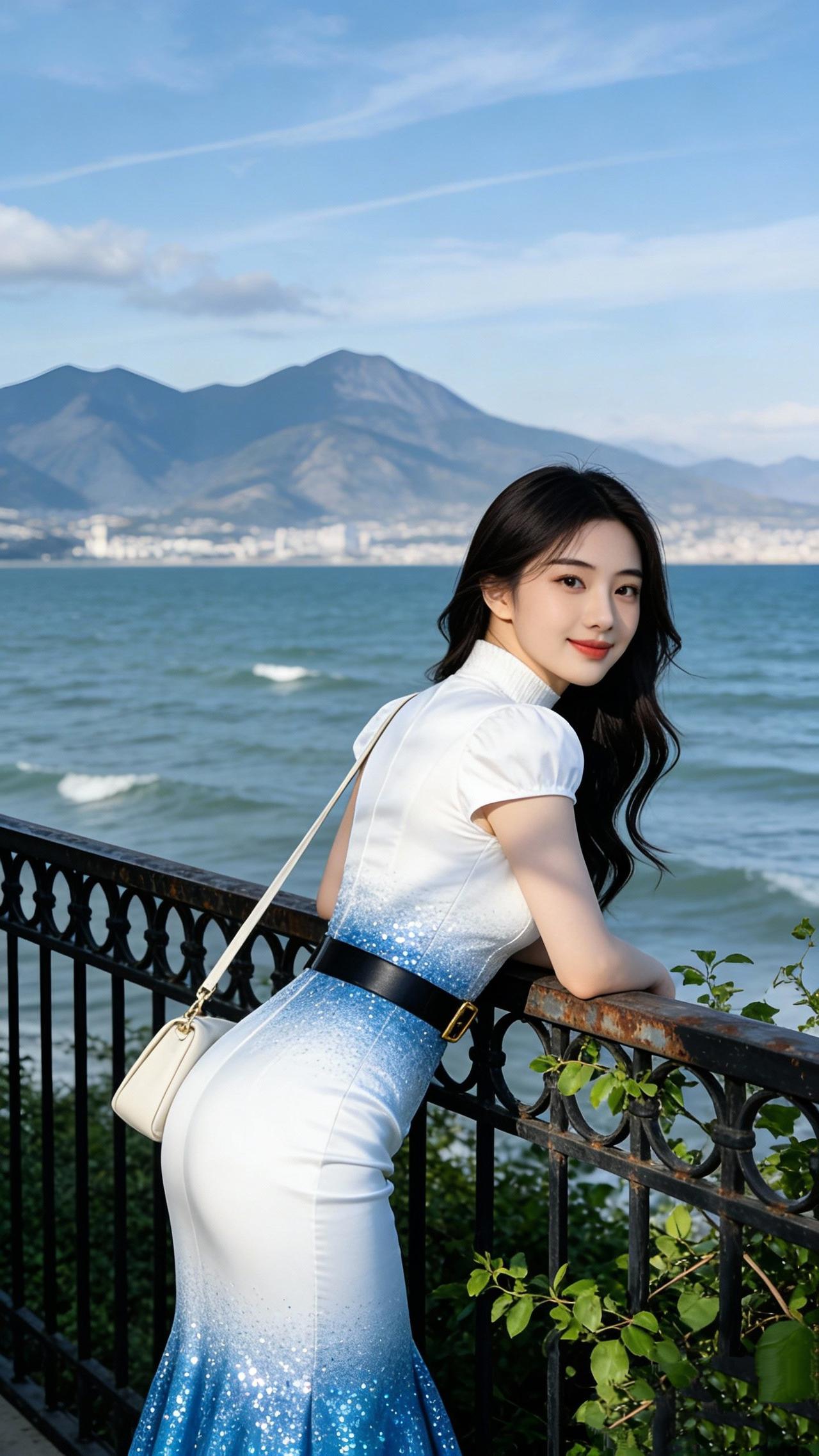 《海畔倩影》 碧海衔山入远空, 云光轻抹黛眉峰。 一袭星锦依栏立, 风送温柔入画中。 赏析:这首小诗以画面中的海边景致为背景,先勾勒出碧海连山、天光云影的壮阔远景,再聚焦于倚栏而立的人物,将人物的温婉与自然的澄澈相融。“星锦”一词既点出裙装蓝白渐变、缀有闪片的视觉特点,又赋予服饰星河般的浪漫感;末句“风送温柔入画中”则把场景的静态美转化为动态的温柔意境,让人物与山海风光浑然一体,勾勒出清新又雅致的画面氛围。水边淡影韵 海边诗行 海畔晨妆 海畔遐思 雾海诗行 晚海倩影