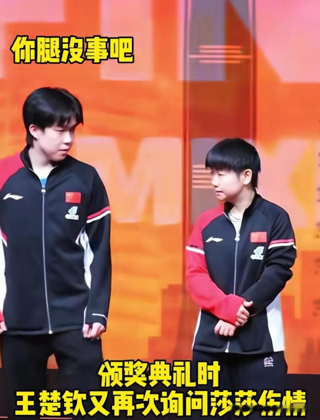 王楚钦这几个暖心的举动感动了多少网友我不知道,我只知道我哭了一次又一次…… 莎莎的脚伤导致与蒯曼的半决赛中断了。 短暂的休息后莎莎与王楚钦混双决赛打外协,莎莎带伤坚持…… 比赛期间大头关切莎莎的脚伤,并在失利时拍拍莎莎的肩膀安慰…… 领奖台上,大头又一次关心莎莎的伤势……并且在莎莎下那几个台阶时,头哥低头看着莎莎的脚……就差没有扶莎了。 心疼这俩优秀的孩子,好好休息! 明年赛场上见!