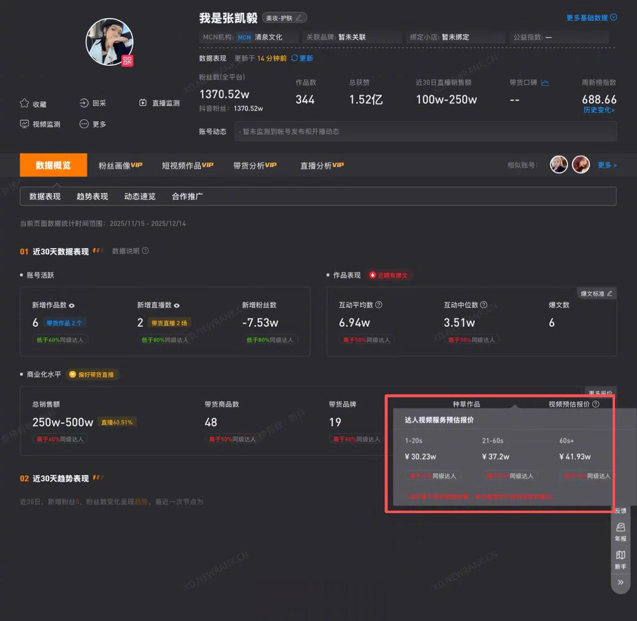 12月15日,查询数据平台显示。张凯毅1个月掉粉近23万,现粉丝已跌至1371.3万。数据平台显示,张凯毅1-20秒广告预估报价为30.23万,21-60秒广告预估报价37.2万,60秒以上广告预估报价41.93万,据平台显示其报价高于70%同级达人。