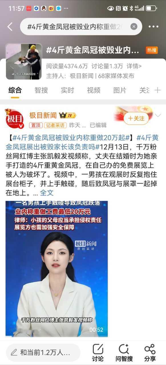 4斤黄金凤冠被毁业内称重做20万起就这玩意工费要20万,不说老庙黄金啊,和其他的一些老凤祥的品牌,工费20万,比他精细的多了去了。这个连镂空都没有,黄金这玩意儿可以融化成水的耶,按现在的工艺倒个模不就成了?20万不可能。