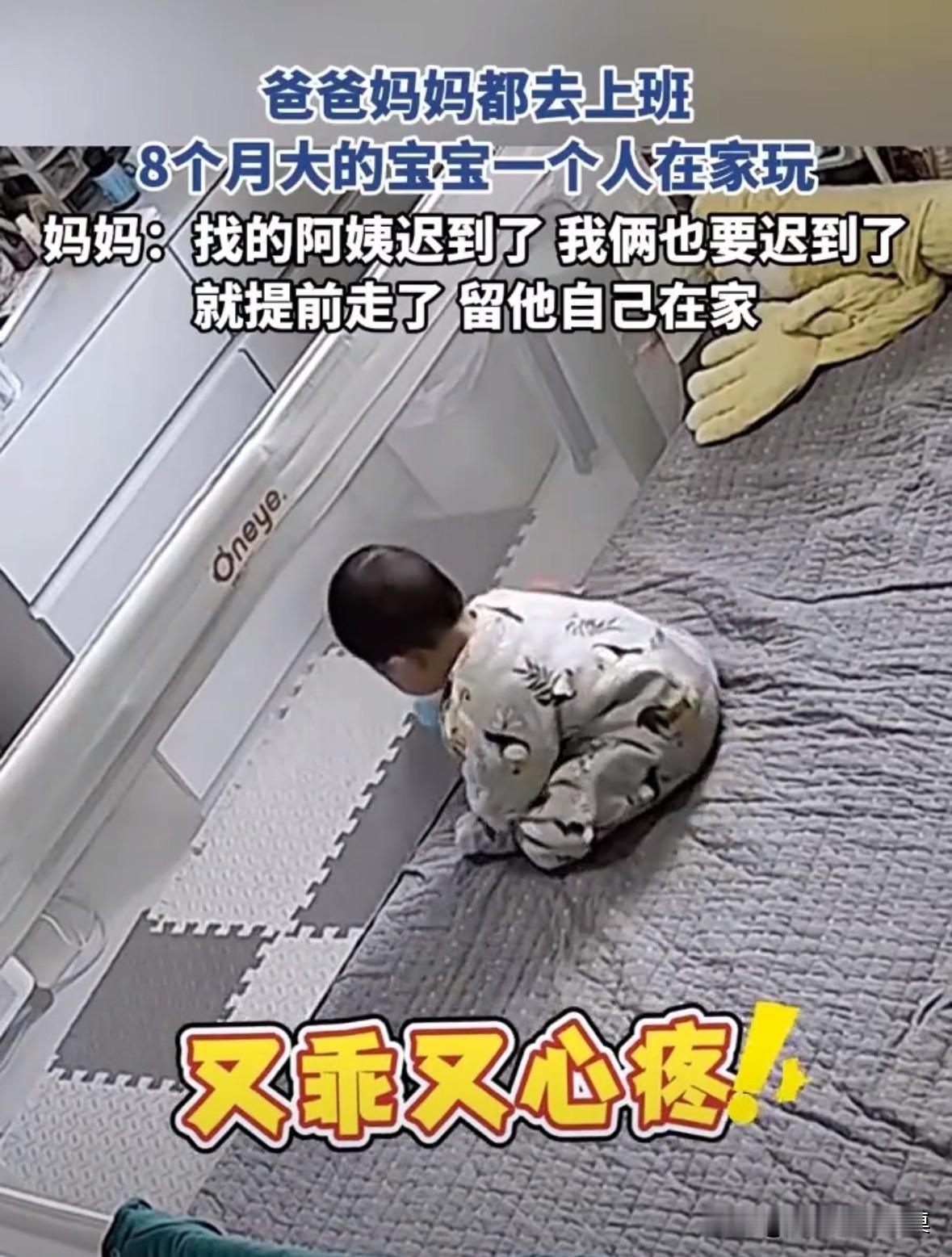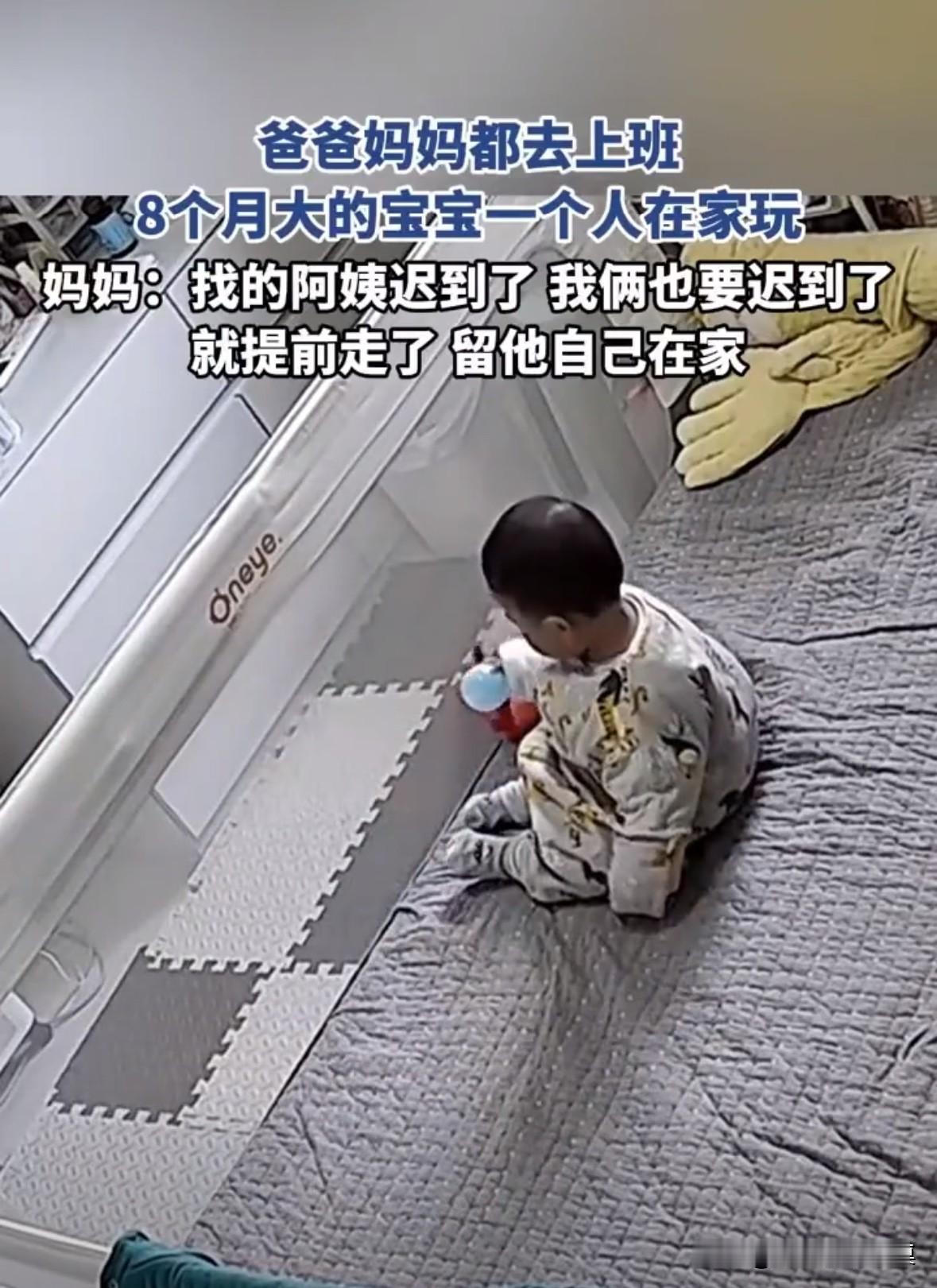 爸爸妈妈都去上班了,让8个月大的宝宝自己在家玩。 妈妈发文说:“我们找的阿姨迟到了,我们俩上班也快迟到了,就提前走了,留宝宝自己在家。” 宝宝一个人拿着玩具在床上玩,不哭也不闹,懂事的让人心疼。 爸爸妈妈其中一个人就不能请一会假吗,跟阿姨交接好了再走,如果宝宝出了什么事,会让你后悔内疚一辈子。 钱重要还是孩子重要?真是拎不清,没时间照顾孩子,就不要把生出来!八个月宝宝