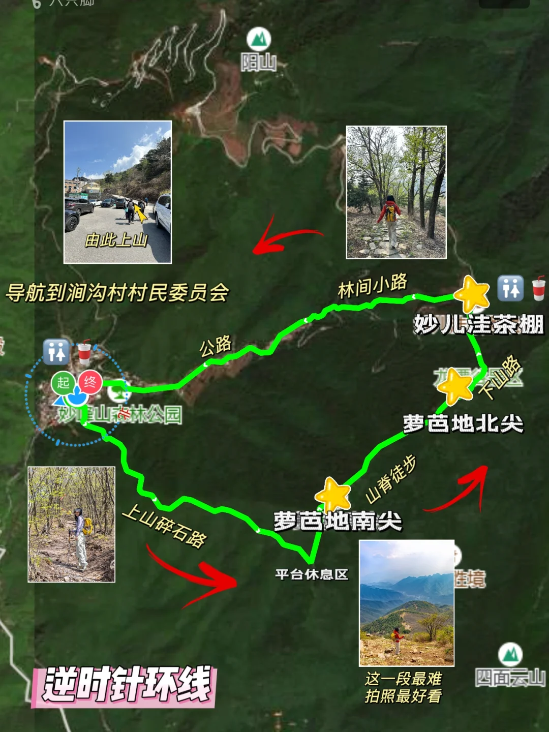 ▶️涧沟村停车场(有卫生间小卖部)▶️妙峰古道中道(一段强度爬升)▶️萝芭地南尖(平台休息区)▶️萝芭地北尖(一段强度爬升,抵达首图壮观打卡地,随后是平路及下山路)▶️妙儿洼茶棚(休息区,有卫生间小卖部)▶️红色交通路(林间石板路穿插公路)▶️公路回到涧沟村