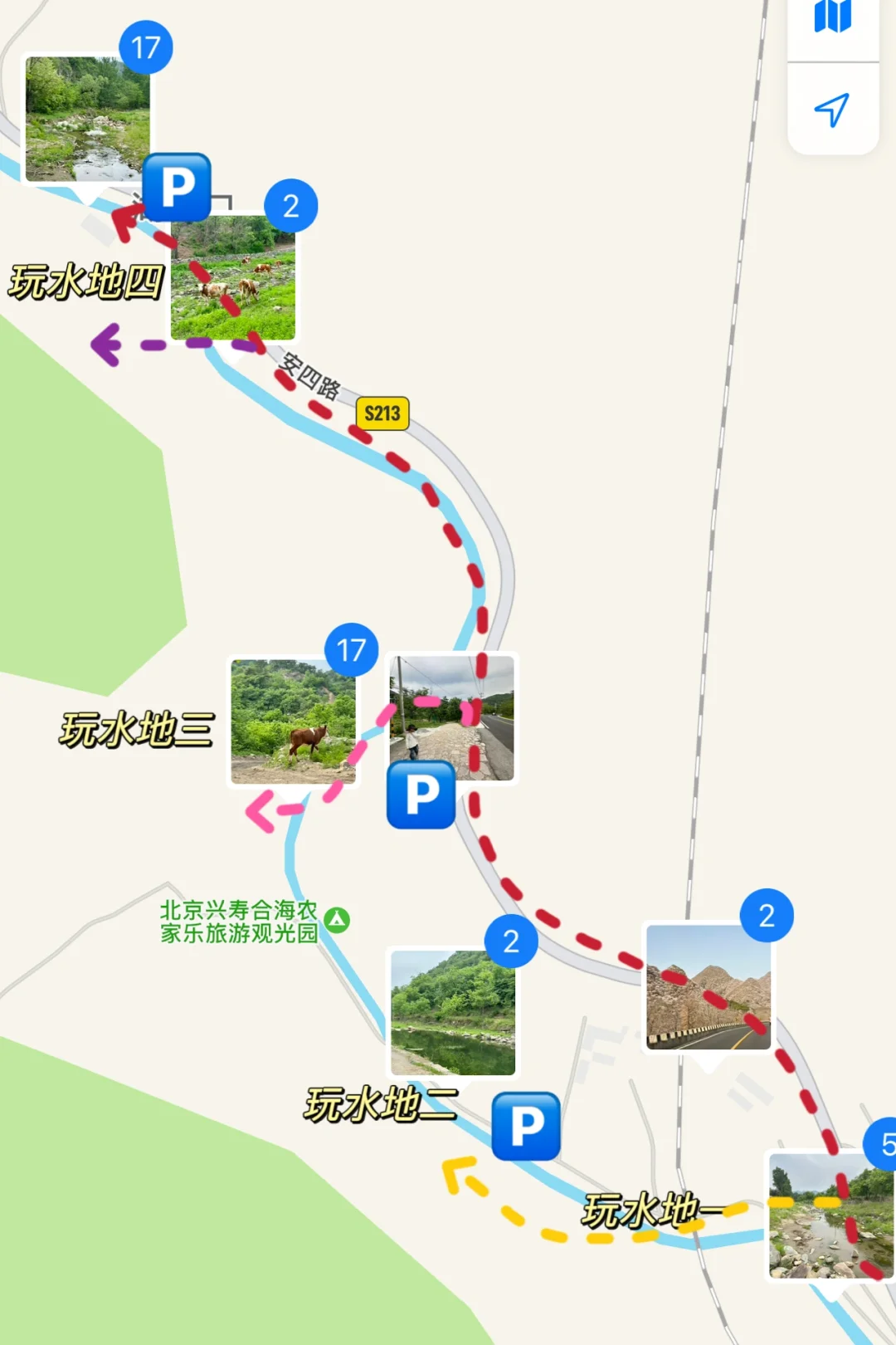 🧭导航“北京兴寿合海农家乐旅游观光园”,过了导航地不远有个岔路口,车可以开下去有个土坡可以停车,往下走2分钟就是一片溪流