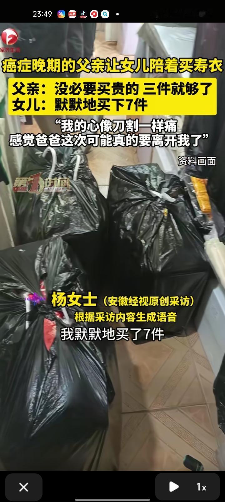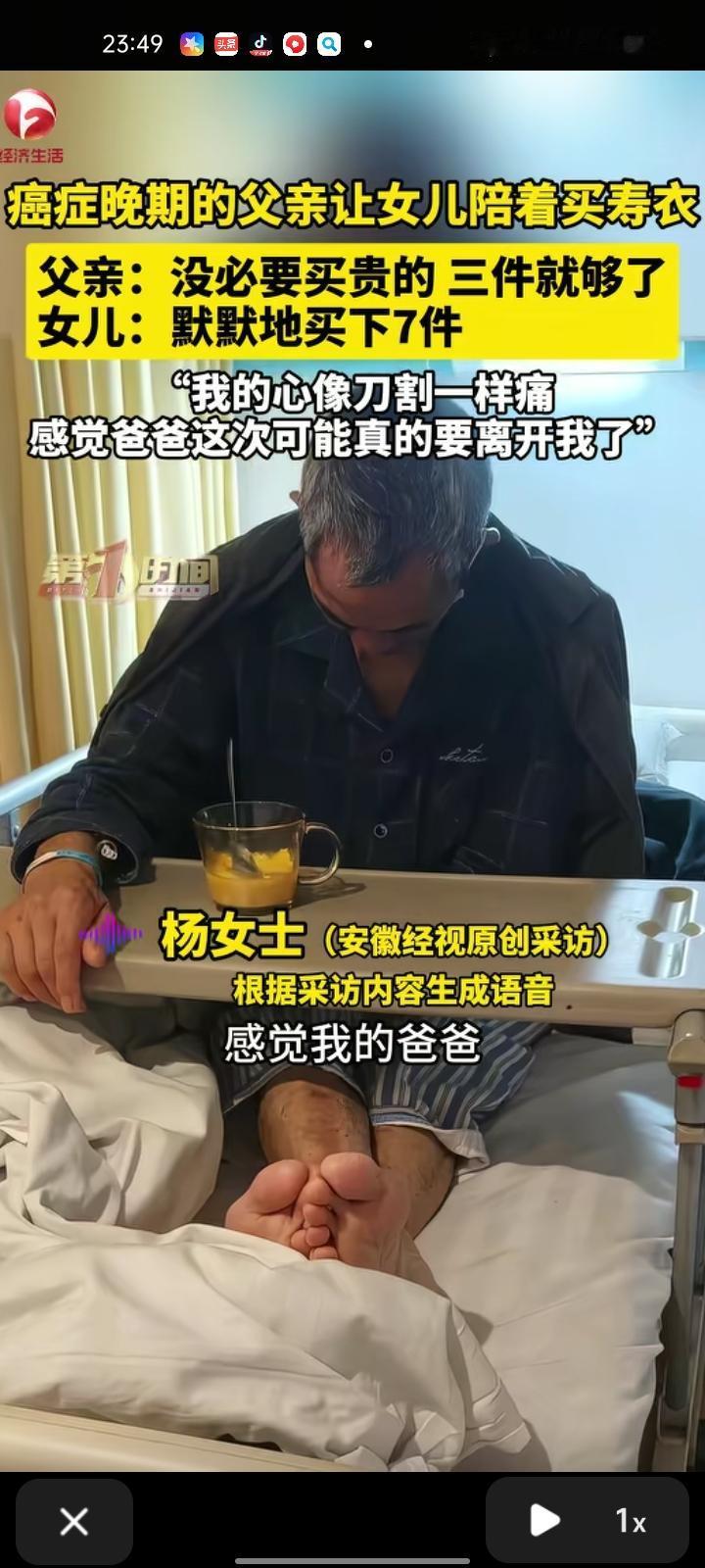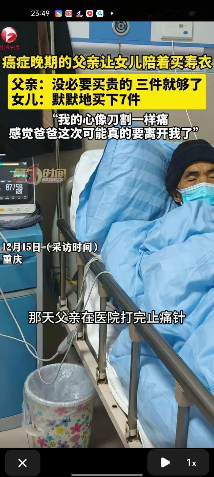 12月15日,重庆。女儿杨女士称,父亲三个月前查出肝癌晚期,之后情况一直不好,基本都在住院。某天,父亲在医院打完止痛针后,就想让她一起去买寿衣。到了店里,父亲说没必要买贵的,只要三件就够了,她默默买了七件。 杨女士还说,回去的路上,父亲跟我说,等他走了埋在哪里。我知道这一天早晚会来,但是我的心里像刀割一样,感觉我的爸爸这次可能真的要离开我了。 人生最大的遗憾,莫过于 “树欲静而风不止,子欲养而亲不待”。当寿衣店里的叮嘱、回家路上关于归宿的闲谈,把 “离别” 二字从遥远的想象拉到眼前时,杨女士心里的刀割之痛,何尝不是无数人藏在心底的软肋。我们总以为来日方长,总把 “陪伴” 推到 “有空以后”,却忘了岁月从不留情,生命里的很多告别,都来不及好好说一声再见。 那些没来得及带父母去的远方,没来得及说出口的感谢,没来得及多陪他们吃的一顿饭,终究会变成往后余生里,一碰就酸的念想。其实,父母要的从来不是昂贵的礼物,而是我们推不掉的陪伴;不是来日方长的许诺,而是此时此刻的相守。趁时光未老,趁双亲仍在,多牵牵他们的手,多听听他们的唠叨,别让这份爱,最终只留下遗憾的回响。