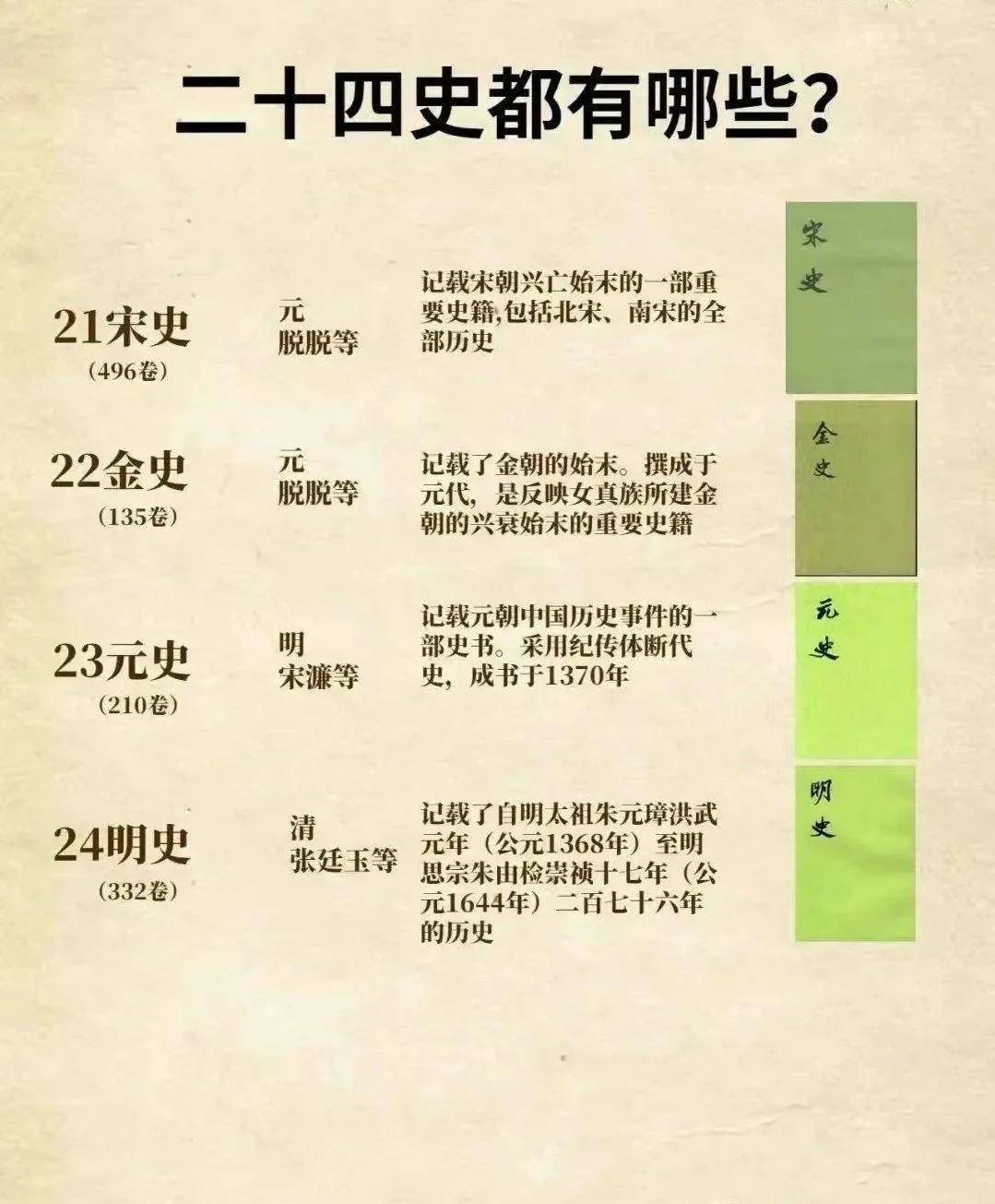 《二十四史》(如果算上《清史稿》则为二十五史)是中国几千年历史文明延续的详细记录。 可以说,中国历史上每一个朝代都有与之相对应的史书文献。
