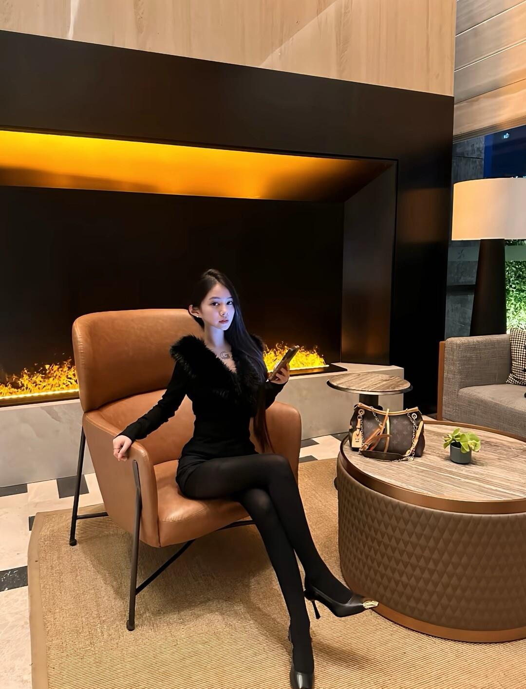 优雅黑衣女郎,手机轻抚,暖火映照,时尚气息扑面而来。