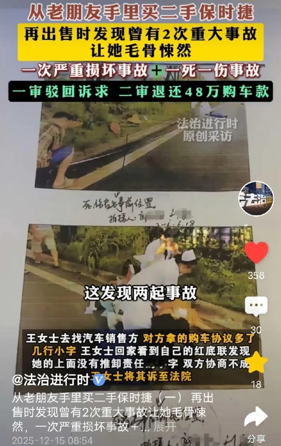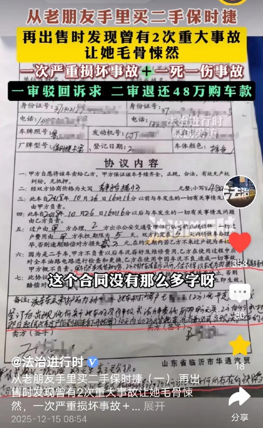 “杀熟老手”山东临沂,女子花48万从20年老友处购买二手保时捷,对方承诺无事故、无调表。谁料,4年后,女子要卖车经检测发现:车辆有29处切割修复,有次一死一伤重大事故,还有一次车辆全损。女子懵了,找到老友理论,没想到,他拿出的合同多了一行免责手写条款,而女子持有的版本却没有。女子气得告上法庭,要求退车退款,法院经过一审、二审判决,结果截然不同。 2018年王女士打算买辆车,平时外出的时候使用,另外,接送孩子上下学也方便。 有一个认识20多年的朋友知道王女士有买车的需求后,就告诉她,他那里有一辆开了几年的保时捷,打算卖出换新车。 王女士一听瞬间两眼放光,一来车子是保时捷,她喜欢的牌子,二来是二手车价格不贵,最重要的是跟熟人买车她放心。 不久后,朋友把车子的照片发给王女士,王女士看到照片后更加心动,当即就表示要过去看看车子。 王女士在看了实体车后,跟朋友商量了价格,最终商定朋友价48万元。 同年10月份,王女士给朋友一次性转了48万买下车子。 当时两人签了购车合同,朋友在合同里承诺,车子无事故、无定表,这个合同和承诺让王女士更加安心,觉得跟朋友买车买得值当。 之后,王女士出行和接送孩子上下学一直使用这辆车,车子开了几年,她也一直小心翼翼,从未出现任何差错。 2022年王女士打算把保时捷卖了,再入手别的车子。 没想到,当她把车子开到第三方检测站去检测后,人家告诉她,这辆车子有29处切割修复,另外还出现两次重大事故,一次是撞人导致一死一伤,一次是车辆全损。 王女士一听,瞬间就不淡定了,她只觉得被朋友坑了,真是应了那句老话这朋友专“杀熟”。 气不过的王女士当即给朋友打电话,朋友先是安慰王女士,然后又东扯西扯,试图掩盖。 王女士也不惯着他,直接找到他家,谁料,朋友竟然拿出当年的合同对王女士说,车子的一切问题当年已经跟你说得一清二楚,过去那么多年,你早忘了吧,你看看合同上不写得很清楚吗? 王女士接过合同一看,上面果然有几行密密麻麻的手写小字:如有任何伤亡事故买方自行担责,已告知买方车况,后续不再追责” 王女士懵了,她从不记得有这些字啊,她怀疑这些字是朋友后面瞒着自己自行加进去的。 为了证实自己的想法,王女士回到家,翻出当年的购车合同红色底联,她这里却没有看到那几行字。 王女士觉得朋友这属于欺诈行为,既然你不仁我也不义。 她把朋友告上法庭,要求撤销购车合同,退还她48万购车款,另外还要追究朋友的欺诈行为主张退一赔三。 一审法院经过审理认为,王女士关于车辆存在重大事故、卖家刻意隐瞒的证据链未完整形成。 而卖家能拿出带有“已告知买方车况,后续不再追责”手写内容的合同,对王女士所持红底联无此手写条款的异议,未形成有利于她的事实认定。最终驳回王女士诉求。 王女士不服,提起上诉。 二审法院经过调查发现,卖家是汽贸公司员工,他早就知道这车有致命事故却故意隐瞒,还在合同上偷偷加免责小字,妥妥的欺诈。 所以二审法院最终判撤销购车合同,让卖家把48万购车款全退了,不过8千块鉴定费得王女士自己出,不过她后来提的退一赔三,因为过了期限没能得到支持。 这场纠纷最戳心的莫过于二十年老友的“杀熟”行径。 王女士基于数十年情谊全然信任对方,不仅冲着心仪的保时捷品牌,更因“熟人买车靠谱”的想法爽快付了48万,甚至对合同承诺深信不疑。 可卖家却利用这份信任,刻意隐瞒车辆致命事故和切割修复的真相,事后还篡改合同添加免责条款,把多年交情当成牟利的筹码。 这种“杀熟”远比陌生人欺诈更伤人,它践踏的不仅是交易诚信,更是人与人之间的情感根基。 王女士的愤怒与崩溃,本质上是对“熟人信任”被背叛的绝望,而二审的判决,既是对欺诈行为的惩戒,也算是给被辜负的情理讨回了一丝公道。 根据《民法典》第157条规定,民事法律行为无效、被撤销或者确定不发生效力后,行为人因该行为取得的财产,应当予以返还;有过错的一方应当赔偿对方由此所受到的损失。 本案中,二审法院认定卖家构成欺诈并撤销购车合同后,依据该条款判决卖家全额返还48万元购车款。 这笔钱是卖家基于欺诈性购车合同从王女士处取得的财产,合同撤销后自然丧失合法占有依据,必须返还。 但王女士主张的三倍赔偿未获支持,核心原因是:双方属于个人间二手车交易,卖家并非以经营为目的的经营者,无法适用《消费者权益保护法》的“退一赔三”规则。 而且王女士在上诉期内未明确提出三倍赔偿诉求,庭审结束后补充主张已过期限。 至于8千元车辆鉴定费,法院裁量由王女士自行承担,是因为该费用属于她为举证产生的支出,并非卖家欺诈直接导致的必然损失,故未认定为需要卖家赔偿的“损失范畴”。 最后,熟人交易绝非“免死金牌”,诚信是底线,任何隐瞒、欺诈终将付出代价;消费者也需擦亮双眼,守住证据,才能护好自身权益。