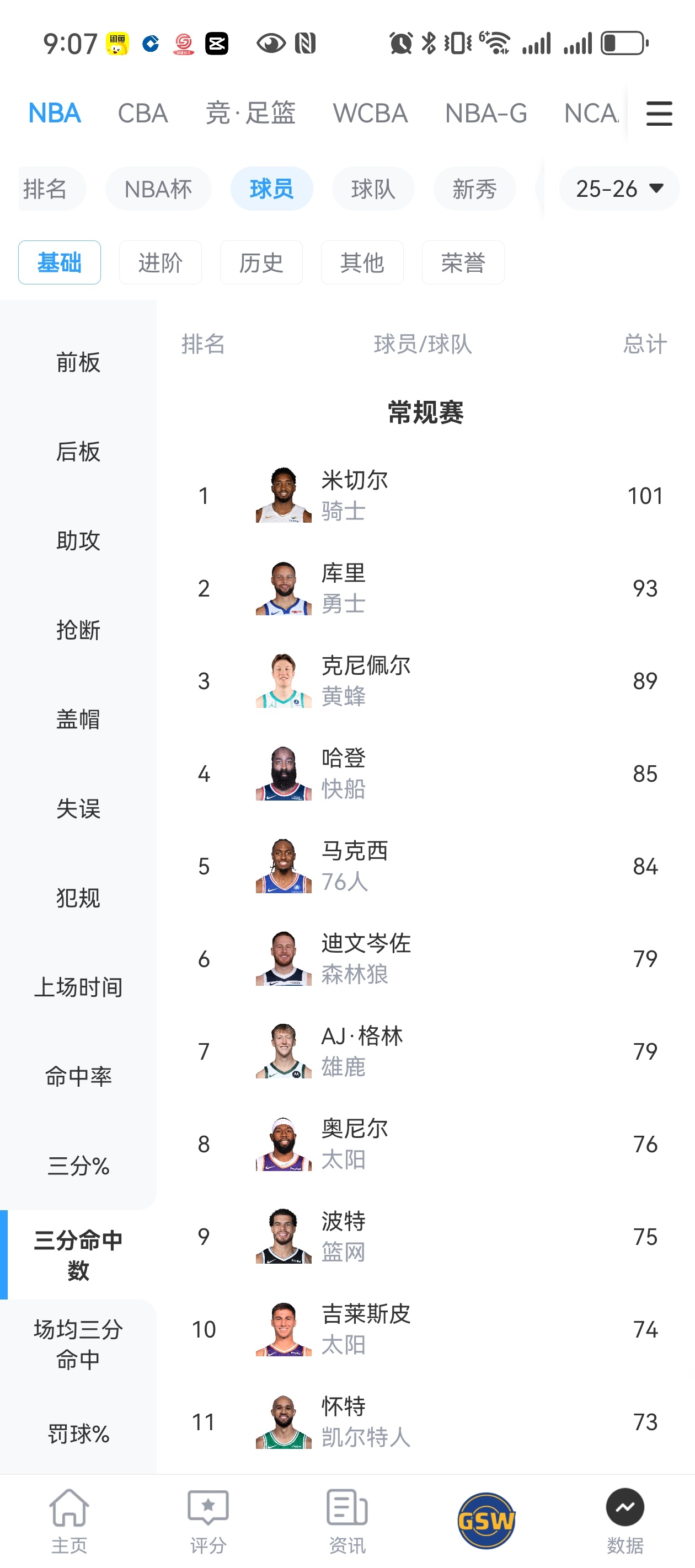 一场比赛投进12个三分球,库里直接从本赛季三分榜第六升到第二,可是第一的米切尔比