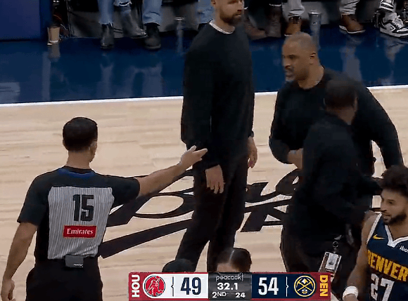 比赛的第二节,申京篮下进攻未果,乌度卡不满裁判抱怨与申京双双吃T。
