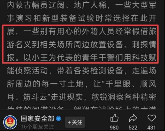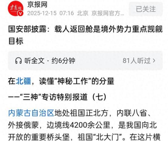 国安部称境外势力觊觎我国载人返回舱和逃逸塔,都是谁?有何目的   “看着航天员安全走出返回舱的那一刻,所有的辛苦都值了。” 国安干警小张这句话的背后,藏着一场无声的较量。   12 月 15 日国安部微信公号披露的专访里,那句 “载人返回舱、火箭逃逸塔是境外势力重点觊觎目标”,把边疆隐蔽战线的紧张感直接拉到了眼前。   在内蒙古那个被称作 “神舟家园” 的着陆场周边,看似平静的草原下,间谍的眼睛从未离开过这些 “太空归舱”。   先说说到底是谁在打这些航天重器的主意。专访没直接点出具体国家,但结合这些年的公开案例一琢磨,答案其实很明确。   首当其冲的就是以美国为代表的西方国家情报机构,这从他们常年的操作就能看出来 —— 之前路透社还炒作所谓 “中国偷雷达芯片”,本质就是自己对敏感技术搞封锁,还反过来贼喊捉贼。   除了官方情报机构,还有些受他们操控的第三方组织,这些人常披着 “科研考察”“旅游探险” 的外衣,在着陆场、军工企业周边晃悠,实则在摸情况、放设备。   更隐蔽的是网络间谍,专门盯着航天单位的系统漏洞,就盼着能扒出点技术图纸。前阵子光明网还曝光过境外间谍用快递传涉密文件的案子,可见他们的手段早就渗透到各个环节了。   这些势力费尽心机,到底图啥?说穿了就是 “技术偷师” 和 “战略压制” 两大算盘。先看返回舱,这玩意儿可不是简单的 “太空座舱”,它的热防护材料能扛住返回大气层时几千度的高温,这种技术要是搞到手,直接能用到高超音速武器的弹头设计上。   而且返回舱的姿态控制、精准回收技术,对改进导弹再入轨道、提高命中精度至关重要。再说说逃逸塔,这东西被称作航天员的 “生命之塔”,能在火箭发射故障 2 秒内把返回舱拽到安全区,靠的是特制的固体火箭发动机和精准的弹道控制技术。   别小看这技术,固体发动机的推力控制、快速点火等核心能力,正是导弹武器系统的关键一环。境外势力把这些技术弄到手,既能缩短自己的研发周期,还能反过来针对我们的航天安全搞制衡。   更阴险的是,他们想通过窃取技术打乱我国航天的发展节奏。现在我国载人登月、空间站建设都在加速,返回舱和逃逸塔是整个航天体系的 “安全基石”。   要是核心数据泄露,不仅后续任务的技术路线可能被预判,甚至还会被人针对性设置安全陷阱。就像包头的军工企业那样,之前也成了境外势力的目标,幸亏干警小陈提前堵住了监控死角和网络漏洞,才没让机密外泄。   这背后其实是场科技霸权的博弈 —— 他们自己搞技术封锁,不让我们用先进设备,转头就想偷我们的研发成果,典型的双重标准。   值得庆幸的是,北疆早就筑起了看不见的防线。每次神舟飞船返回前,国安干警都会提前进驻着陆场,小张从 2012 年入职以来,已经连续守了 10 次航天任务,把返回舱的转运路线、存放点的安防都摸得一清二楚。   不光是干警,牧民们也成了 “编外卫士”。之前有不明身份的人想采集草原的土壤样本,立马被保护区群众制止举报;军事基地周边发现可疑电子装置,12339 举报电话很快就响了。   这些牧民可能不懂什么叫 “弹道闭环控制”,但他们知道 “家门口的秘密不能让外人偷”,这种全民警惕才是最牢的安全网。   现在的境外势力越来越狡猾,他们不再是简单的 “实地窥探”,而是用上了大数据伪装。但国安干警也有应对招术,在鄂尔多斯的能源基地,他们用人工智能监测供应链安全。   在着陆场周边,小王这样的青年干警带着检测设备地毯式排查,把 “千里眼”“顺风耳” 用到了实处,再隐蔽的间谍设备也藏不住。   这其实说明,守护航天安全不光要靠人盯人,更要靠科技赋能,把 “草原绿” 和 “数据蓝” 拧成一股绳。   说到底,境外势力对返回舱、逃逸塔的觊觎,本质是对我国航天崛起的焦虑。从神舟飞天到梦舟试验,我们用几十年走完了别人上百年的路,他们靠技术垄断维持霸权的日子不好过了,才会想出这种 “偷师” 的歪招。   但他们忘了,中国的航天安全从来不是靠被动防守 —— 干警们的日夜坚守、科研人员的技术加密、牧民们的全民守护,早已织成了一张立体防护网。就像北疆的风再烈,也吹不垮那些扎根草原的 “国安蓝”,这才是我们最硬的底气。
