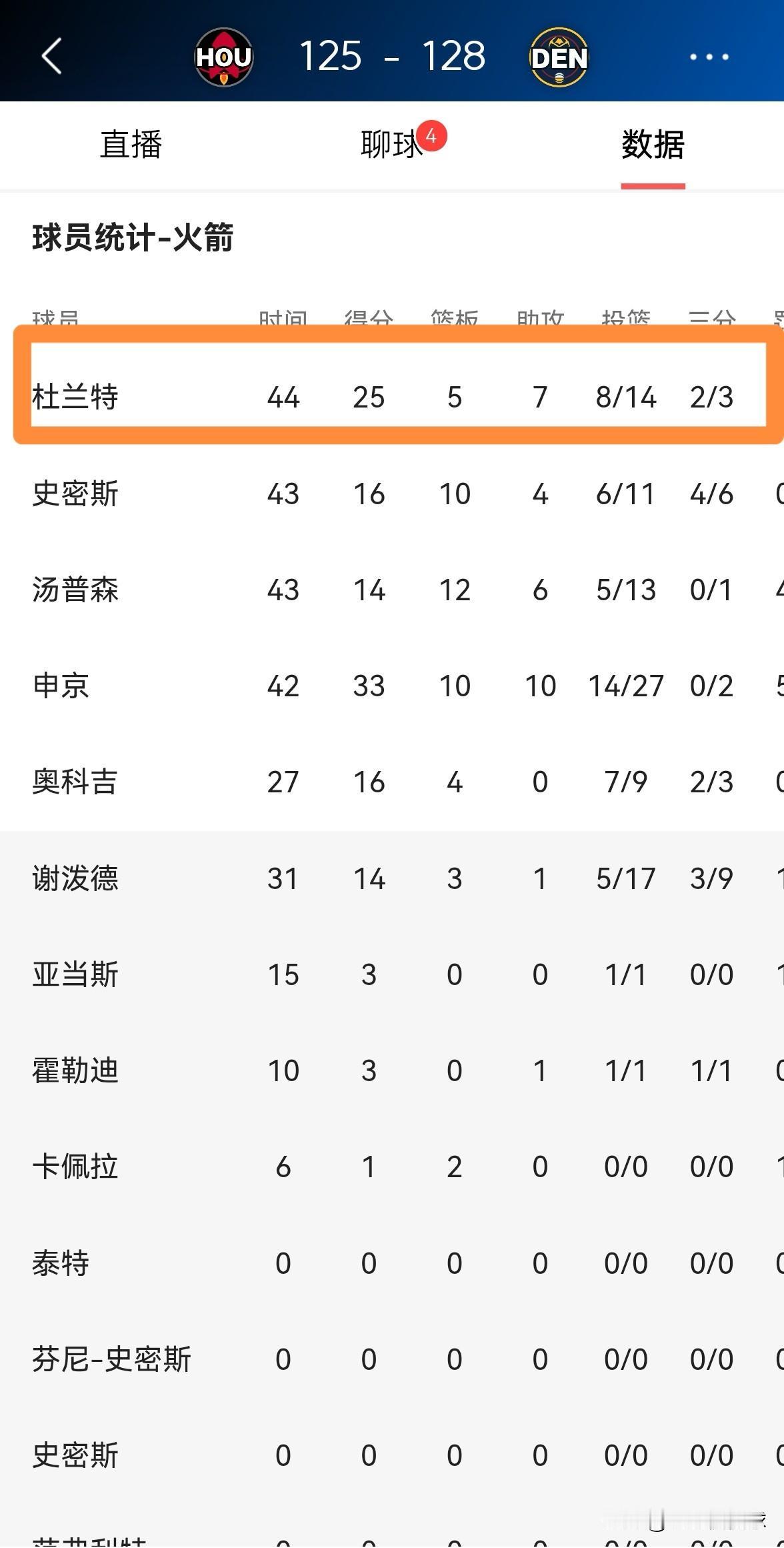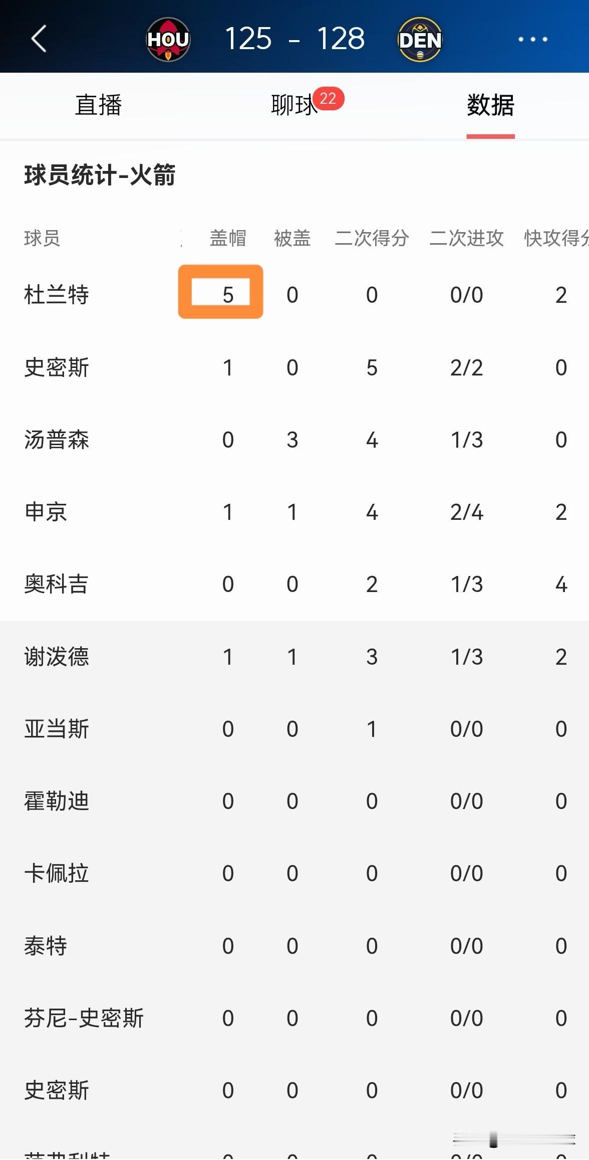 火箭老将杜兰特真是拼了老命了,他疯狂的送出5记盖帽。在今天火箭客场以125:128不敌掘金的比赛中,杜兰特首发出战44分钟,投篮14中8,其中三分球3中2、罚球8中7得到25分5篮板7助攻1抢断,他的场上正负值为+2。 最让人感到不可思议的是,本场比赛杜兰特疯狂的送出了5记盖帽。