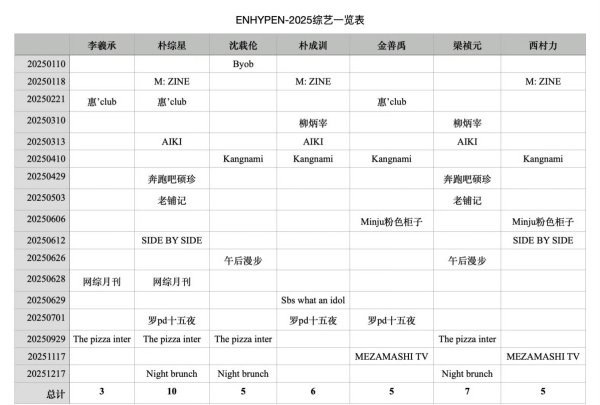 ENHYPEN 2025 资源分配大拉表李羲承 沈载伦 梁祯元 朴成训 金善禹 西村力 朴综星