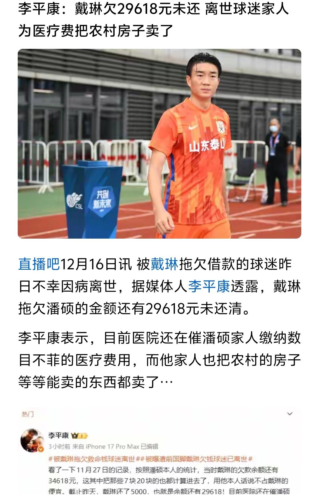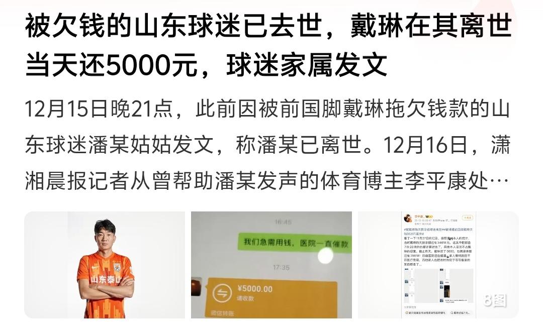 我特别想看看戴琳的后续声明,想看看在戴琳自己眼里,他到底是一个怎样的人! 如今球迷去世了,说的再多也挽回不了了,我特别想知道戴琳巅峰期一年也有几百万收入,他都花哪去了呢?也没听说他涉嫌黄毒啊?如果赌球也会被抓起来啊?所以他的钱都去哪了呢?怎么如今没钱了呢? 虽然球员是吃青春饭的,但是除了在辽宁效力期间收入不高,但是在上海申花和山东泰山收入都不低吧,而且还赶上金元足球,还是持续高收入好多年,不至于一下子全败光了吧! 所以对于戴琳可能的声明,我最想知道他钱都花哪去了!