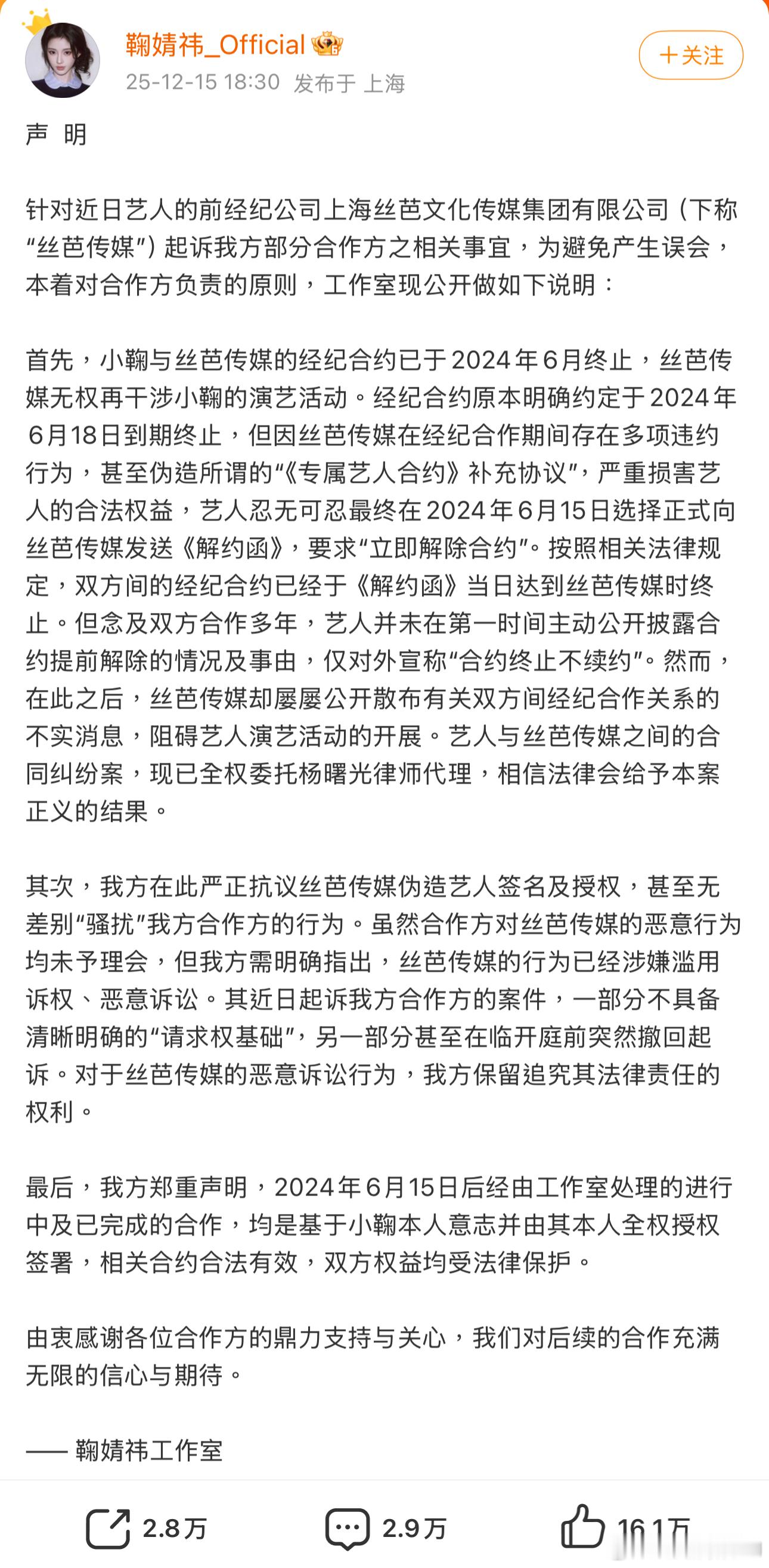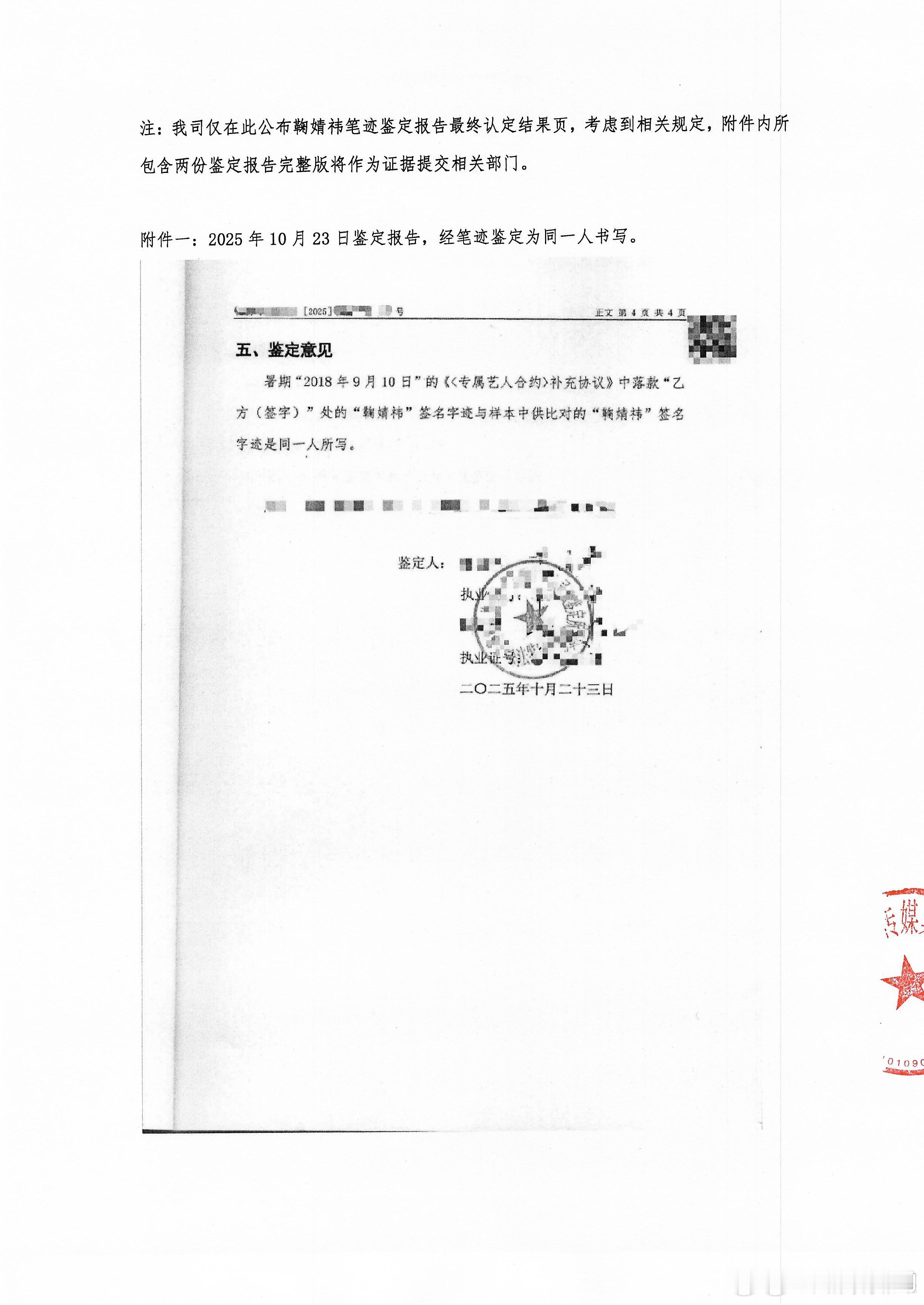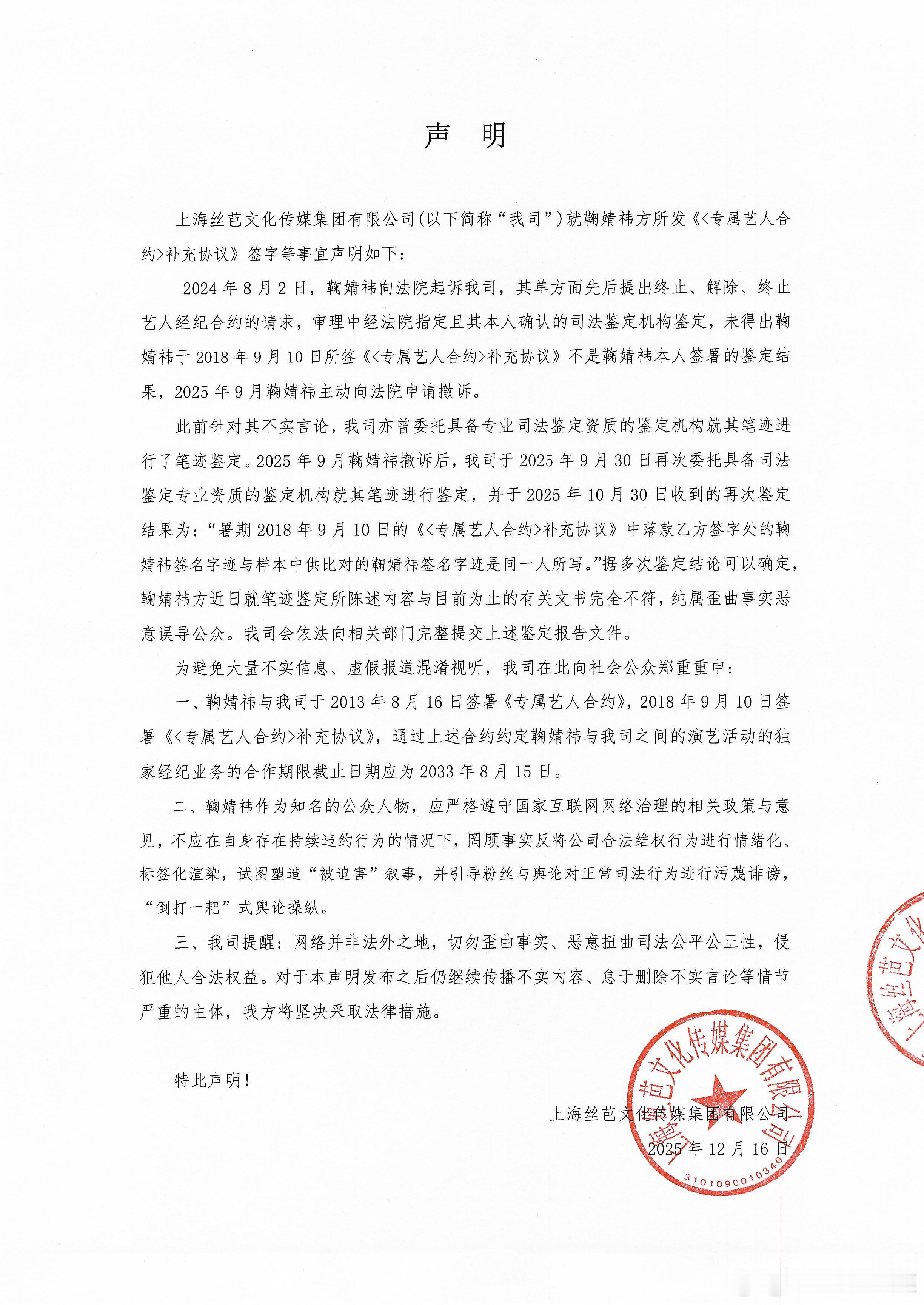 关于和丝芭的合约问题,鞠婧祎方面一直主张约满到期,2018年9月那份所谓的《专属艺人合约》补充协议是丝芭伪造,并在去年7月起诉、申请笔迹鉴定,今年12月15日她现在的工作室又再度发声,强调丝芭所谓的维权是恶意诉讼。丝芭回应鞠婧祎刚刚丝芭传媒公开了一份笔迹鉴定报告,表示“署期2018年9月10日的《补充协议》中落款乙方签字处的鞠婧祎签名字迹与样本中供比对的鞠婧祎签名字迹是同一人所写”,鞠婧祎方近日就笔迹鉴定所陈述内容与事实不符。