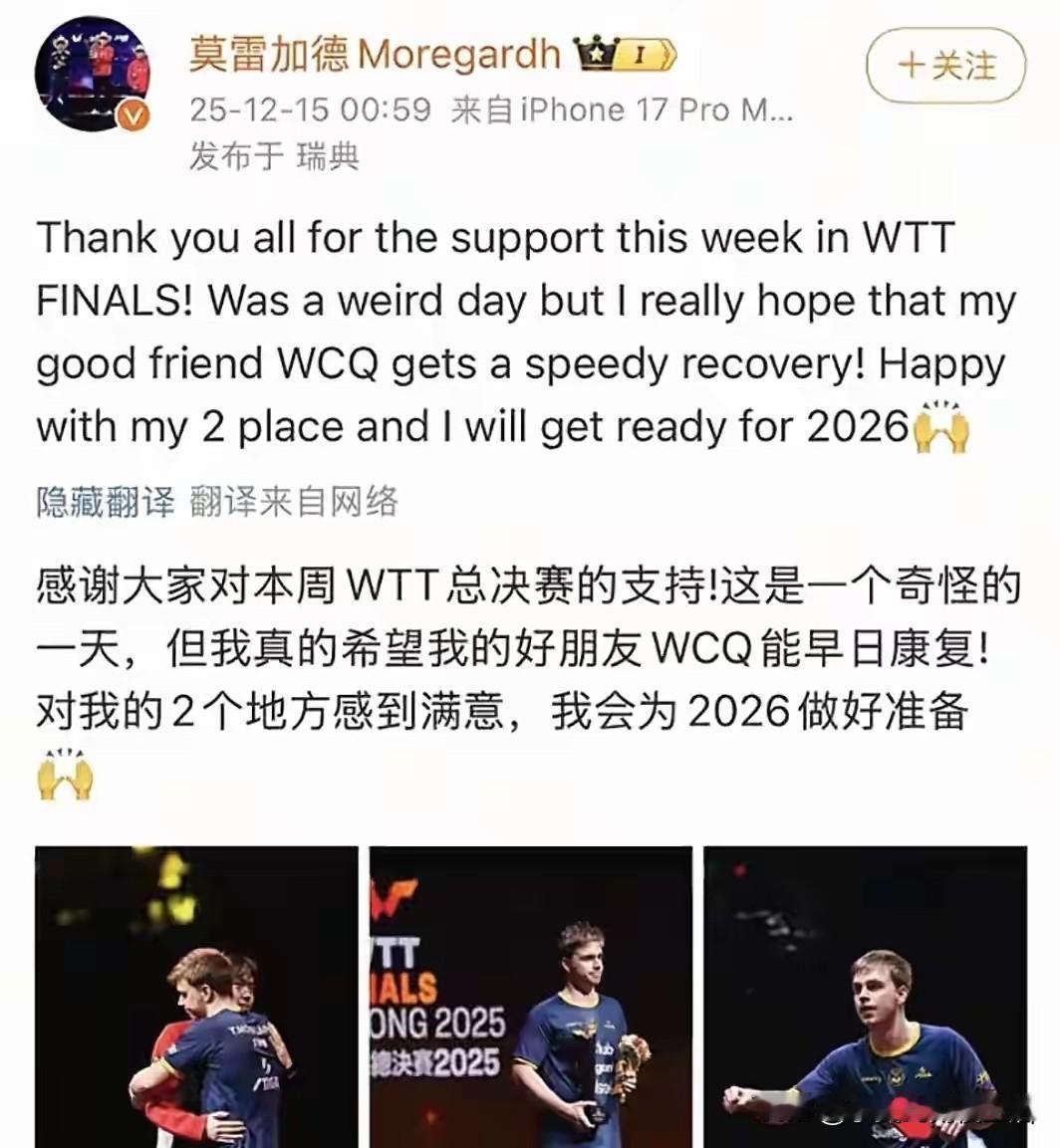 莫雷加德香港总决赛后发文竟然没有张本智和。 莫雷加德说这一天很奇怪。我才他一定