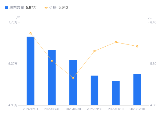 日期A股户数(户)流通A股户均持股数(股)户均持股市值(万元)2025-12-105965419299.5111.462025-11-105721220123.2812.112025-09-305903419502.2011.412025-06-306433317895.849.542025-03-316774516994.519.622024-12-317219215947.659.872024-09-305584620615.4910.272024-06-305611920515.218.442024-03-315749920022.839.242023-12-315731220088.169.47