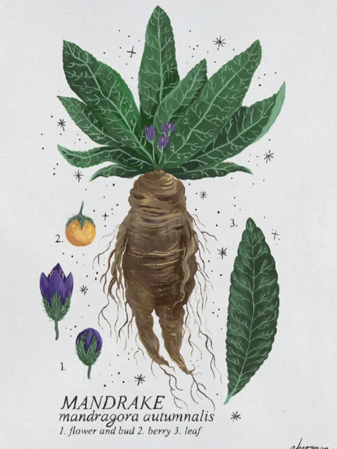 曼德拉草因具神奇的“完人”特征而被视为万应灵药。事实上,这种茄棵植物含有大量有毒的致幻剂(包括天仙子胺,阿托品和莨菪碱)。因此,它成了巫师制作软膏的重要成分并逐渐成为多种巫术的象征。