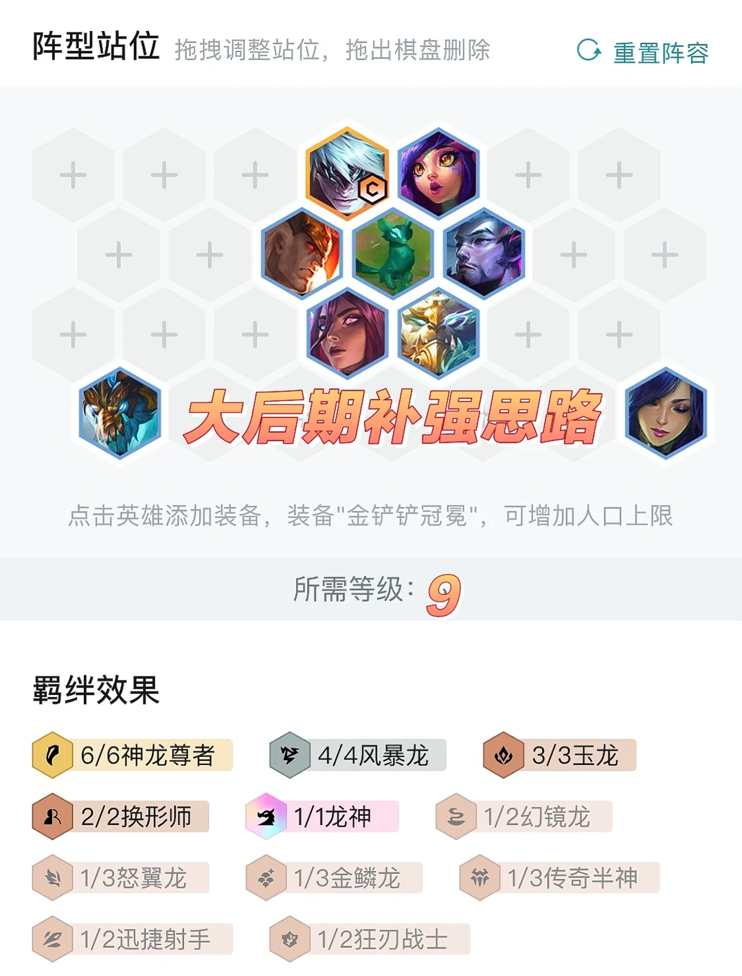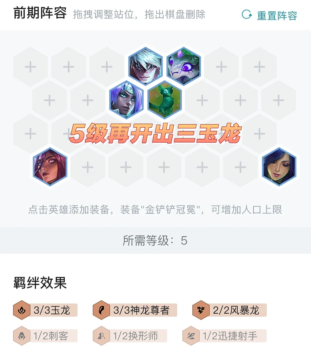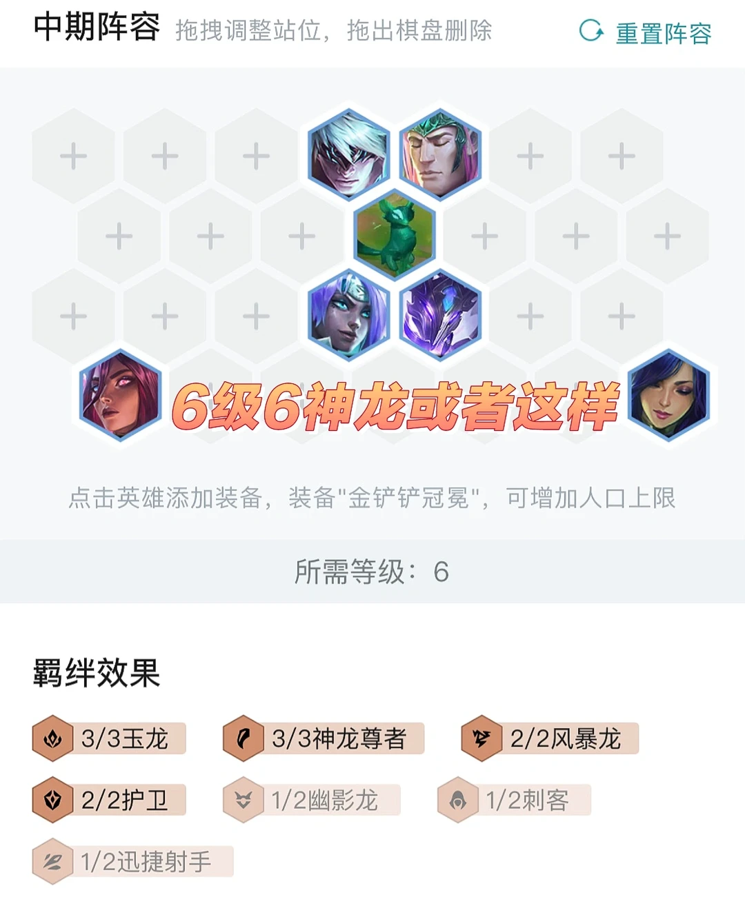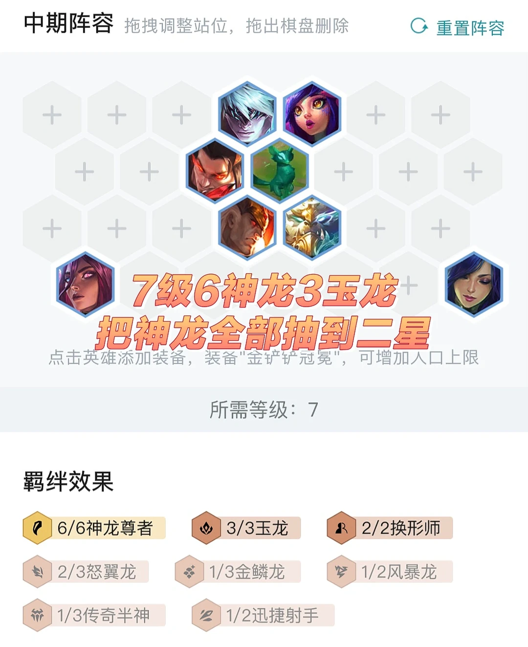 前期思路三神龙尊者两风暴过度。然后依次开出玉龙、6神龙尊者等羁绊,7人口阵容小成,需要将神龙牌全部D到二星即可上人口。