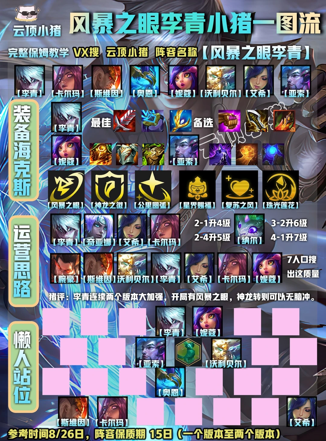 这个阵容很少会有同行,得极其依赖强化符文,一般来说,有风暴之眼、珠光这种战力类符文为基础再玩强度高的多。