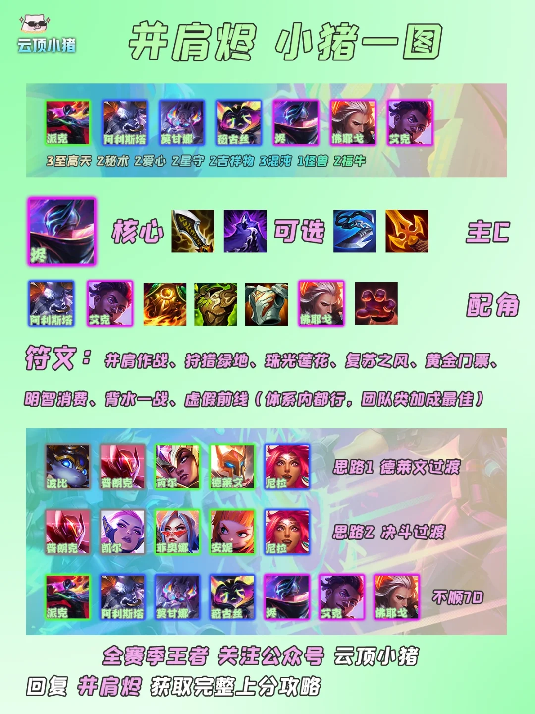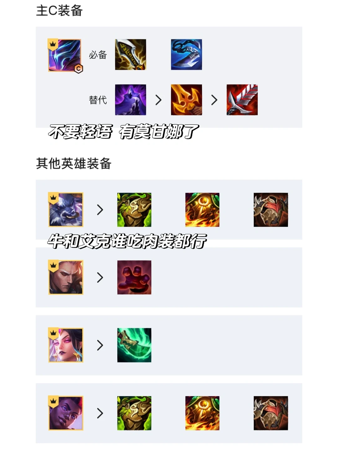 肉装则是给到艾克和牛头,多余输出装偷偷这种就给佛耶戈,青龙刀给辛德拉,其他人不用给装备。