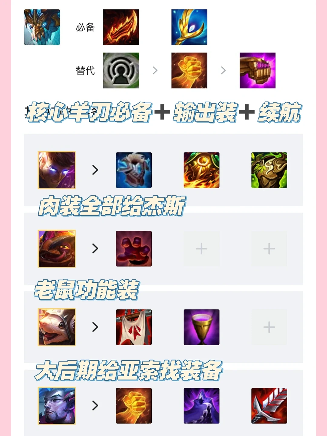 [火R]装备思路:青龙刀改版后,回蓝太少敖兴现在做羊刀收益大于青龙刀。羊刀之后做一件输出装和一件续航装最佳。前期羊刀之后最好是先做肉装更容易连胜,多余法装是没有用的,前期不用选秀去拿。